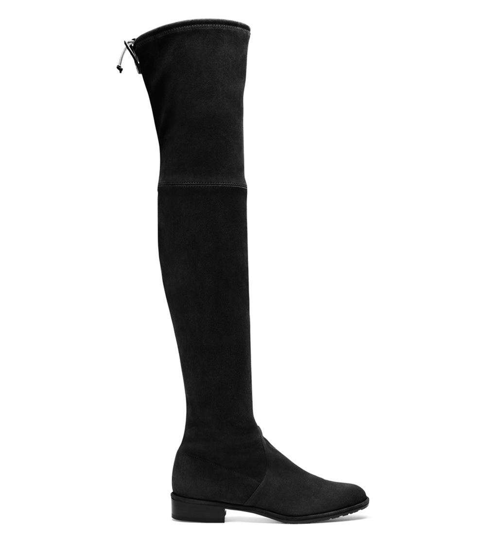 Stuart Weitzman's 'Lowland' boots are so supple and malleable you can style them softly slouched underneath bohemian dresses or smooth over skinny jeans. Made in Spain, this black pair fastens at the back to fit closely above the knee and has a low block heel. Heel measures approximately 30mm/ 1 inch. Black stretch-suede. Pull on. Made in Spain.