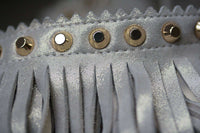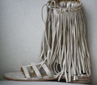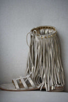 Metallic beige suede 'Fringe Benefit' sandals from Stuart Weitzman featuring fringe details, silver-tone stud detailing, a brand embossed insole and a gladiator design.