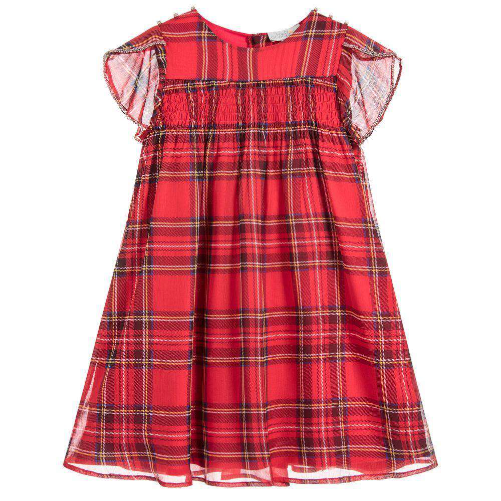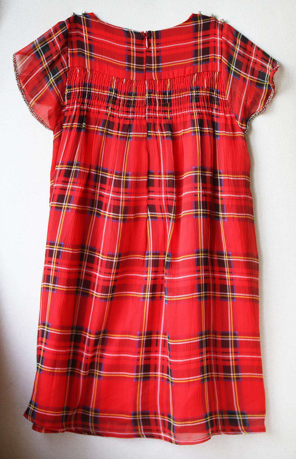 Girls red chiffon tartan dress from Wild & Gorgeous, with silver bead trims on the cuffs and sparkly jewel decoration on the shoulders. The design has a ruched panel across the chest and back, with red cotton lining and concealed back zip. 100% polyester chiffon (soft & sheer). Lining: 100% viscose (soft & lightweight).