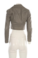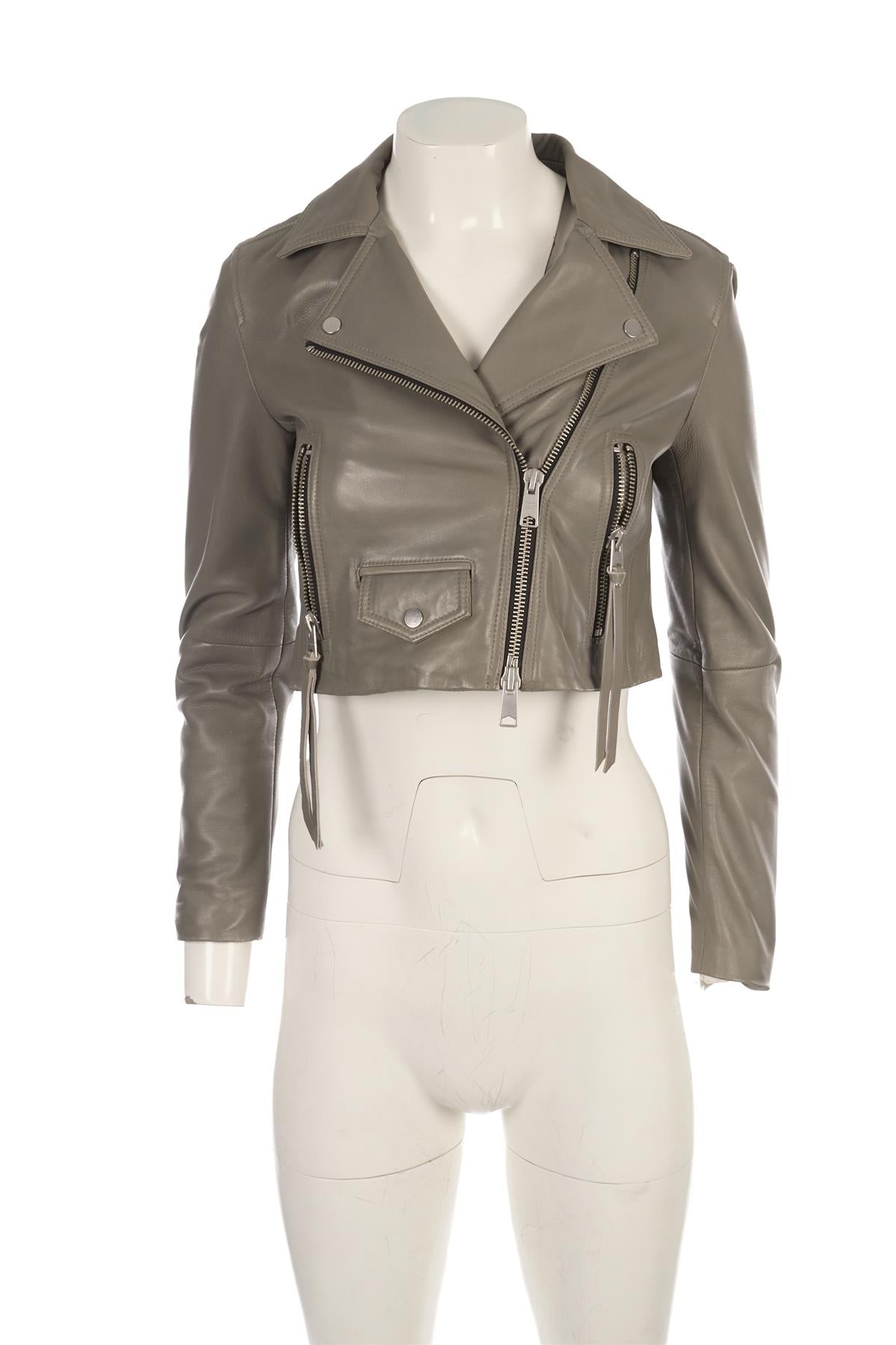 All Saints Grey Leather Jacket. Grey. Long Sleeve. V-Neck. Zip fastening - Front. 100% Lamb Leather, 100% Polyester. UK 8 (US 4, FR 36, IT 40). Shoulder to Shoulder: 15 in. Bust: 32 in. Waist: 31 in. Length: 17.5 in.