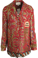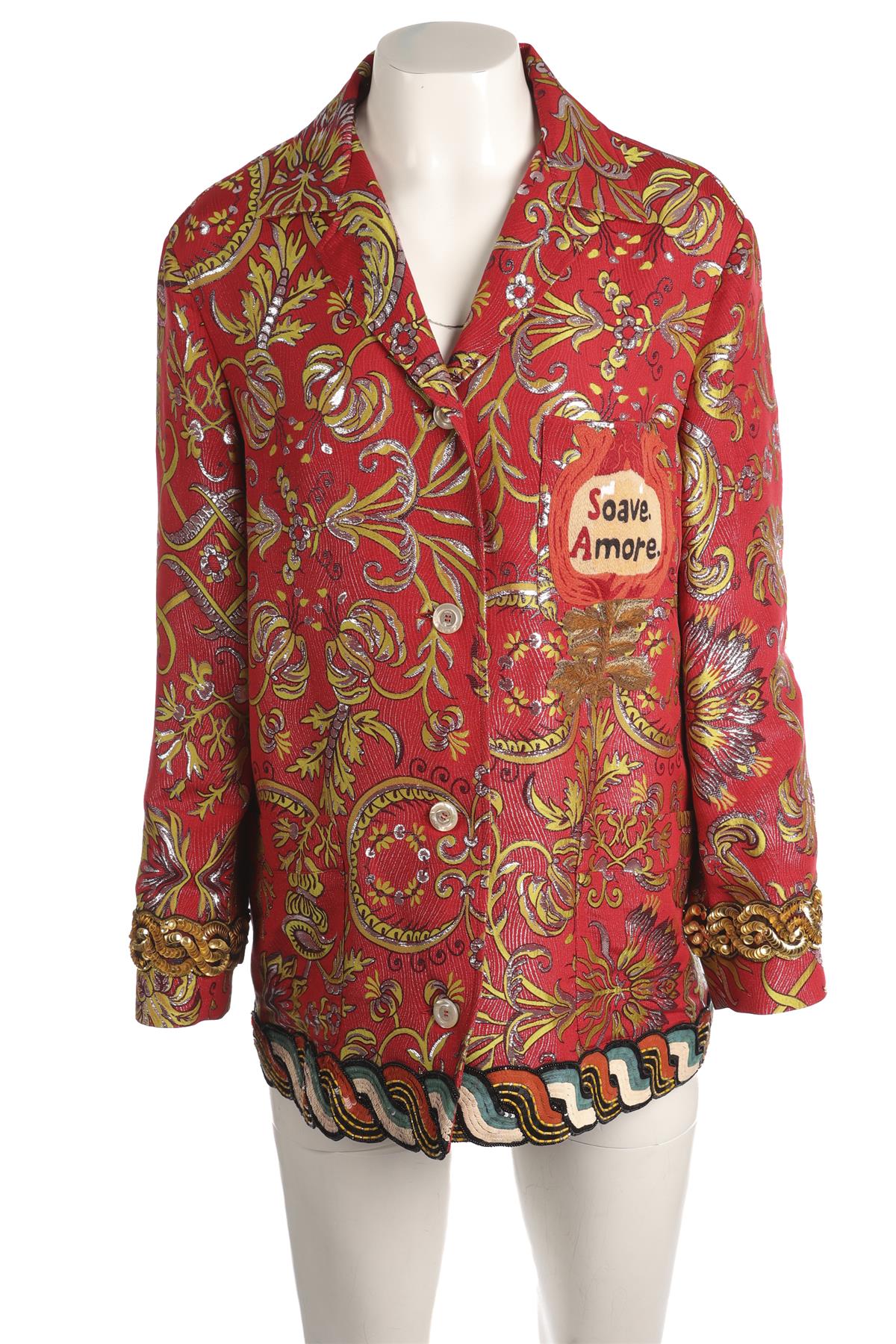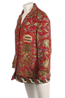 Gucci Red Silk Jacket. Multicoloured. Long Sleeve. Crewneck. Button fastening - Front. 46% Silk, 28% Metalllised Fibre, 26% Polyester. IT 38 (UK 6, US 2, FR 34). Shoulder to Shoulder: 18 in. Bust: 40 in. Waist: 42 in. Hips: 42 in. Length: 29 in.