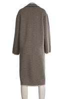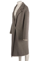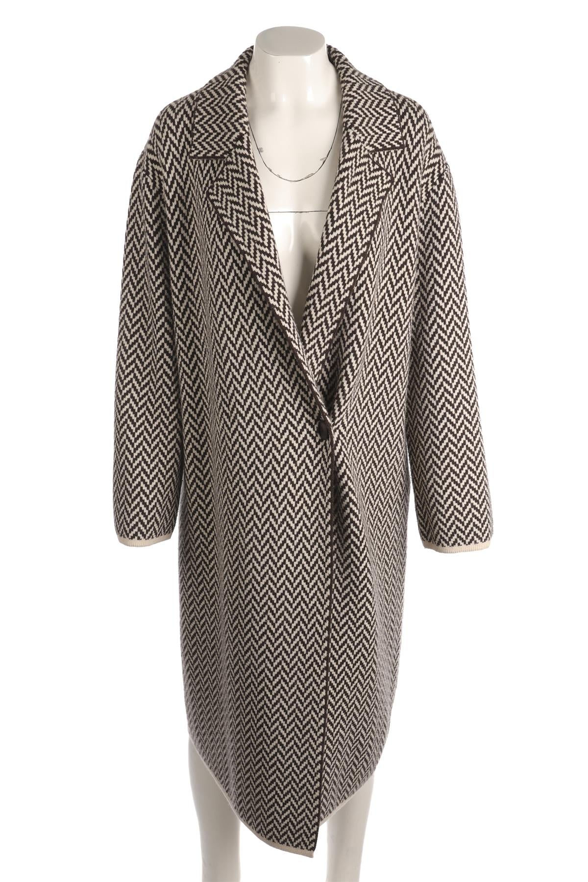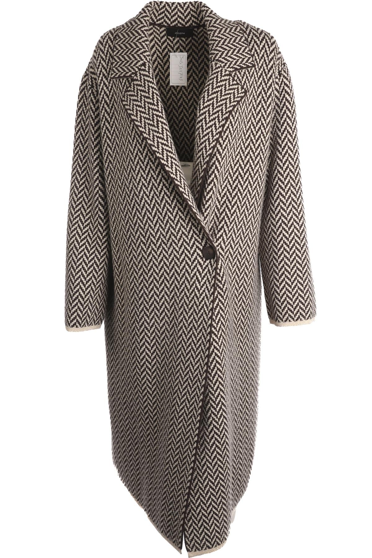 Joseph Brown Wool Coat. Brown and white. Long Sleeve. Crewneck. Button fastening - Front. 100% Wool. XSmall (UK 6, US 2, FR 34, IT 38). Shoulder to Shoulder: 19 in. Bust: 46 in. Waist: 44 in. Hips: 46 in. Length: 43 in.