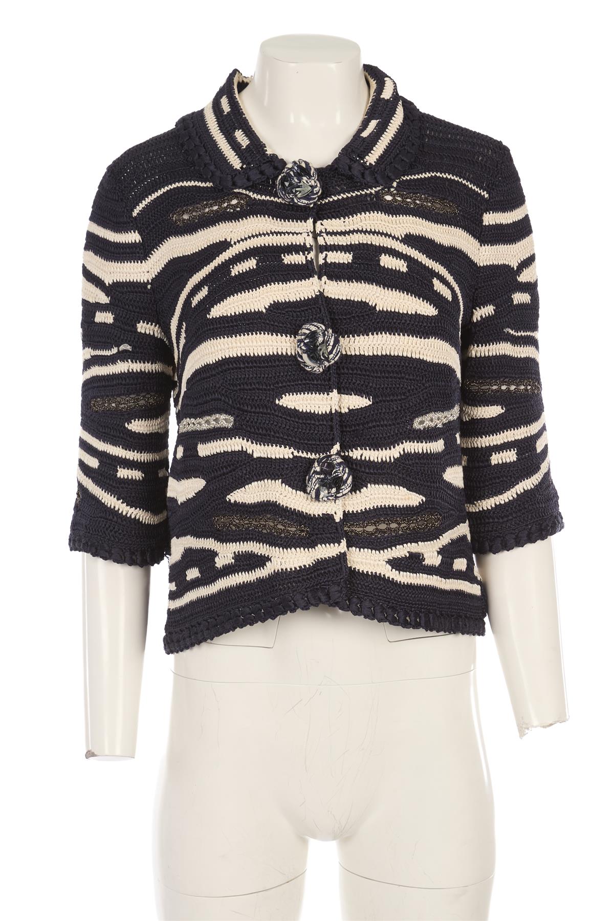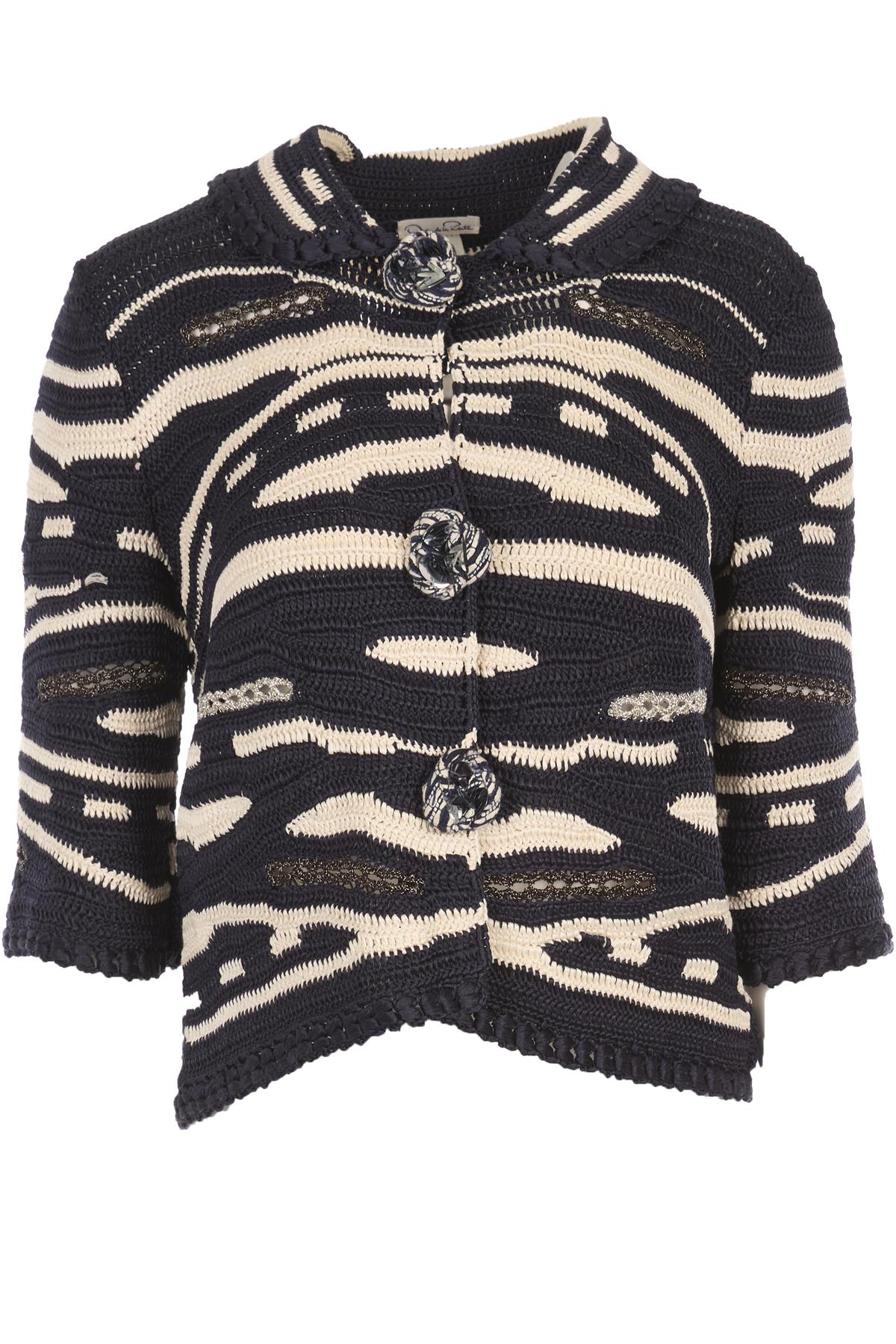 Oscar De La Renta Navy 2010 Knit Jacket. Navy, black and white. 3/4 Sleeve. Crewneck. Button fastening - Front. 100% Silk. XSmall (UK 6, US 2, FR 34, IT 38). Shoulder to Shoulder: 15 in. Bust: 35 in. Waist: 34 in. Hips: 36 in. Length: 20 in.