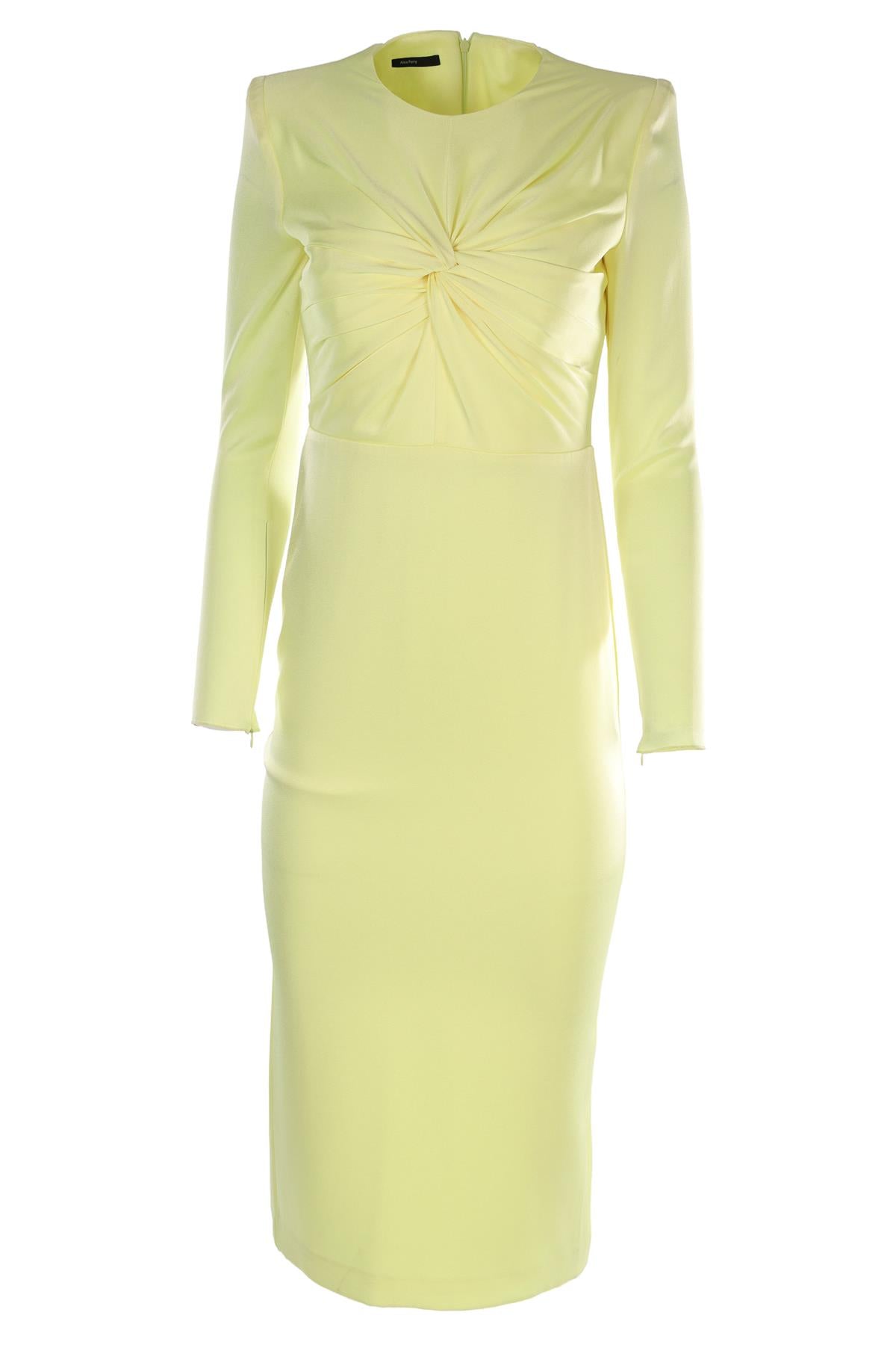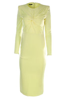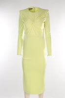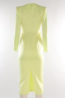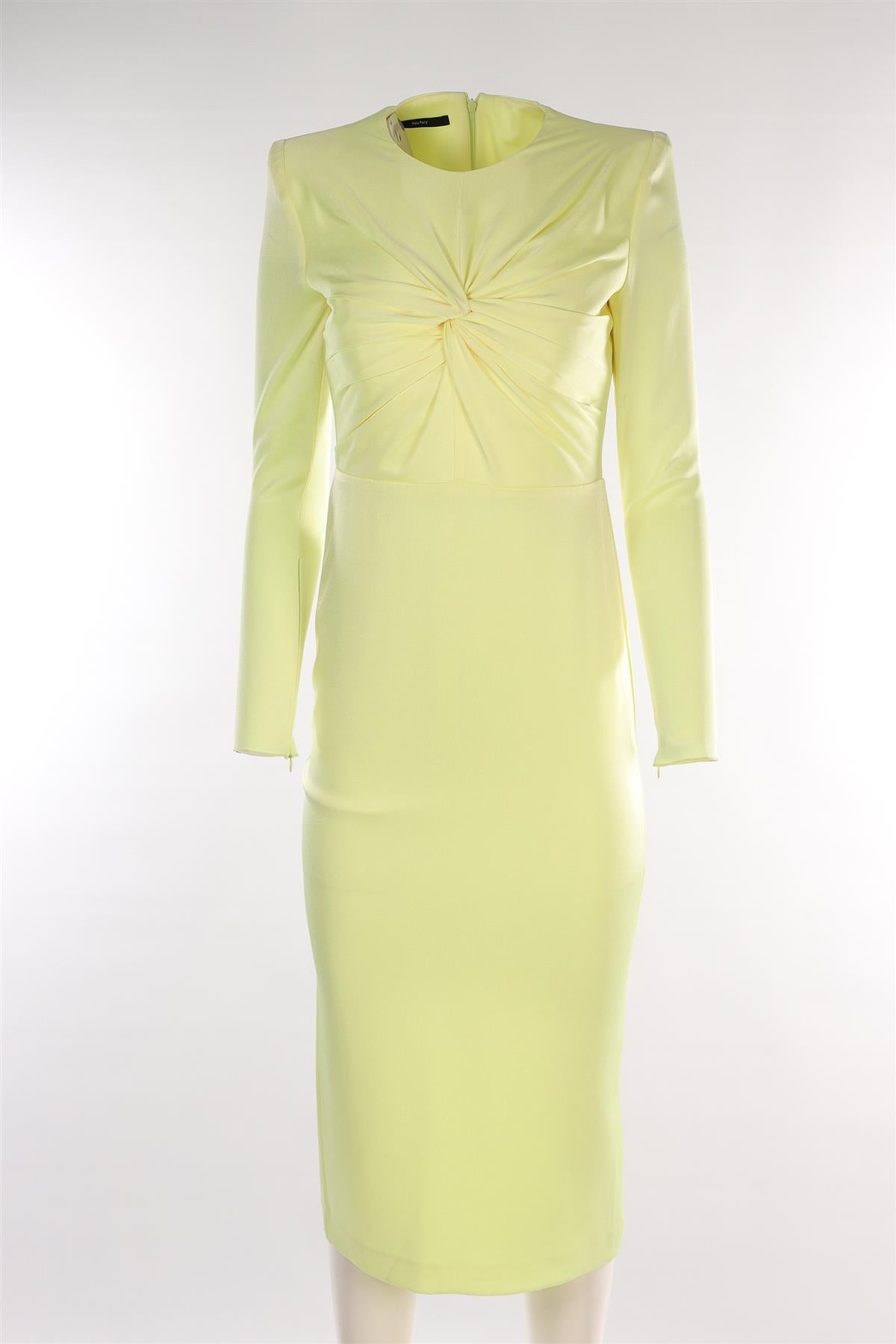 Alex Perry Yellow Satin Midi Dress. Yellow. Long Sleeve. Crewneck. Zip fastening - Back. 82% Tri-Acetate, 18% Polyester. UK 10 (US 6, FR 38, IT 42). Bust: 35 in. Waist: 28 in. Hips: 36 in. Length: 49 in.