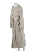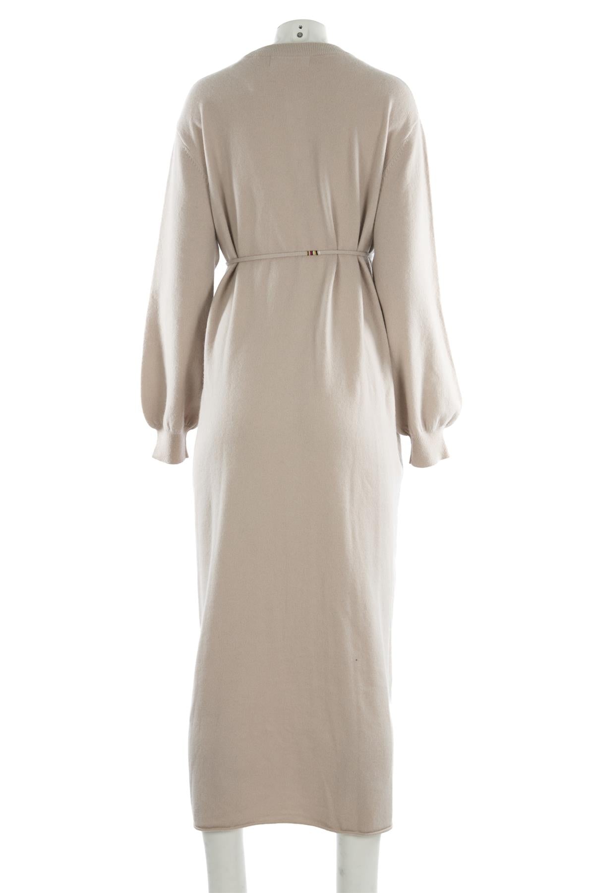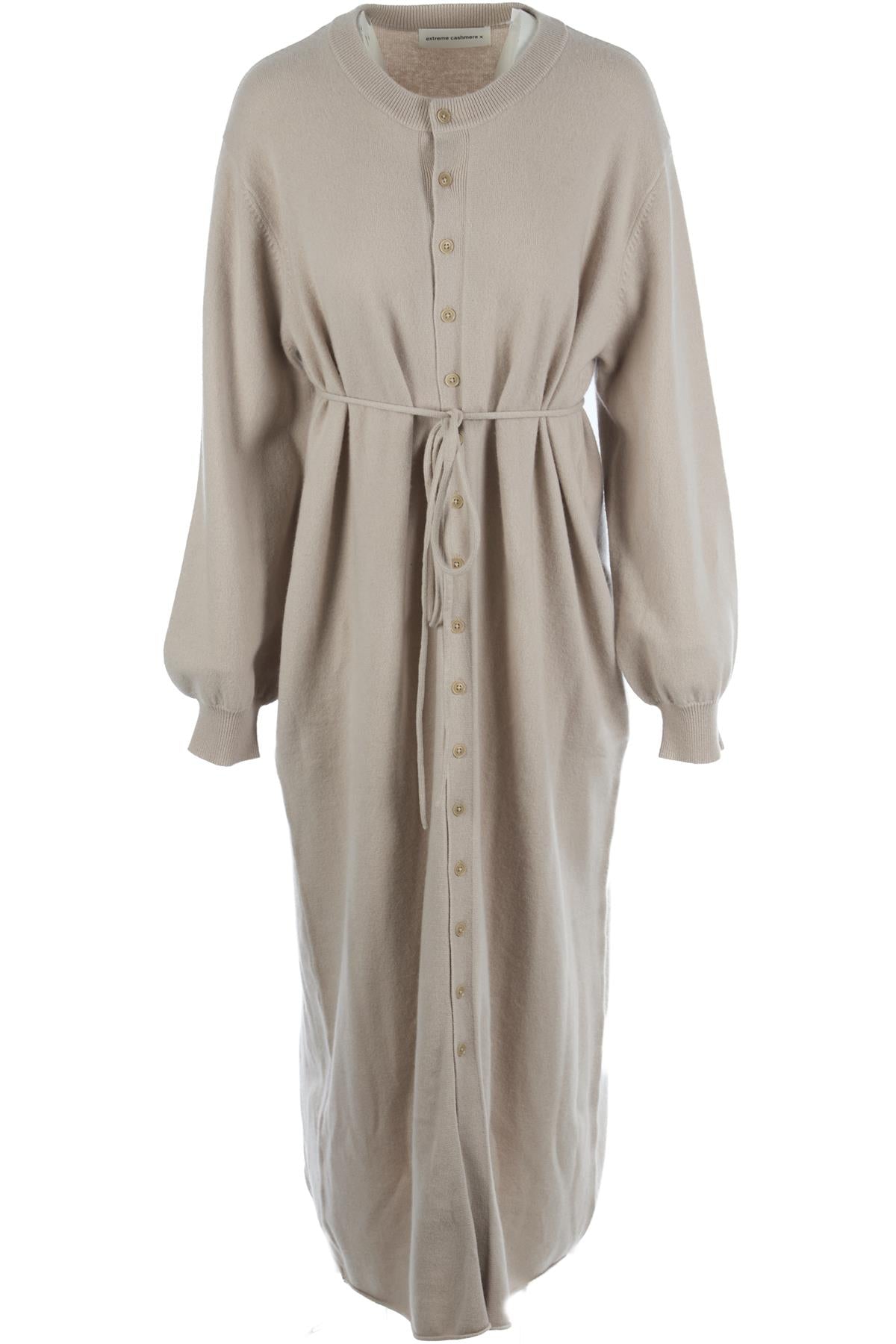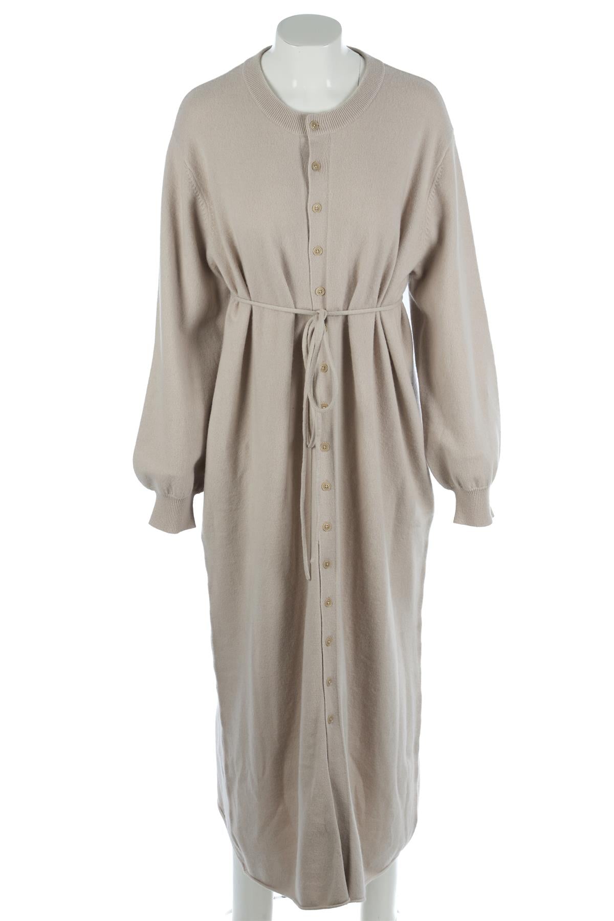 Extreme Cashmere Taupe Cashmere Maxi Dress. Taupe. Long Sleeve. Crewneck. Button fastening - Front. No composition label. One Size.. Bust: 45 in. Waist: 48 in. Hips: 50 in. Length: 51 in.