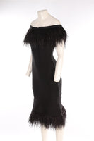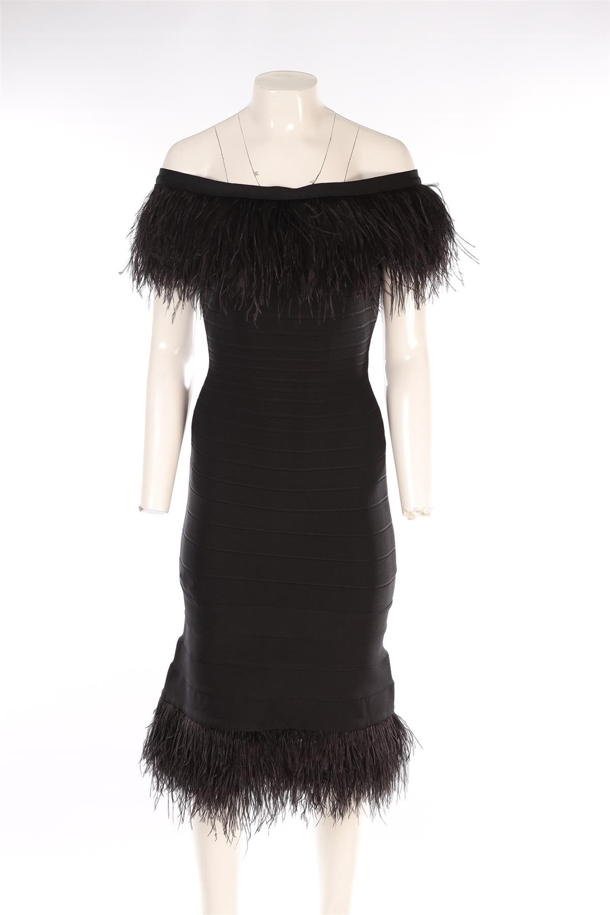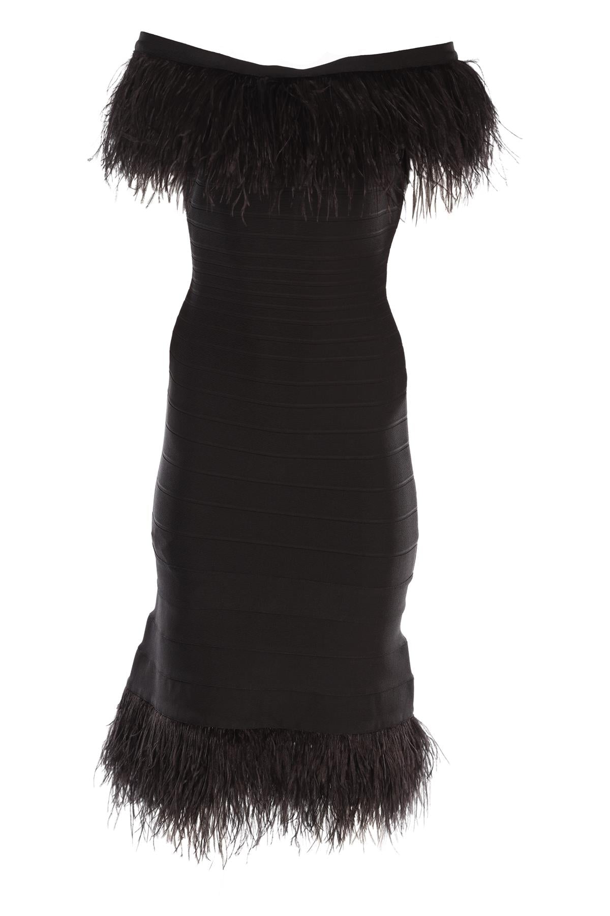 Herve Leger Black Bandage Midi Dress. Black. Sleeveless. Off-the-Shoulder. Zip fastening - Back. 90% Rayon, 9% Nylon, 1% Spandex 100% Ostrich feathers. Small (UK 8, US 4, FR 36, IT 40). Bust: 32 in. Waist: 22 in. Hips: 30 in. Length: 33 in.