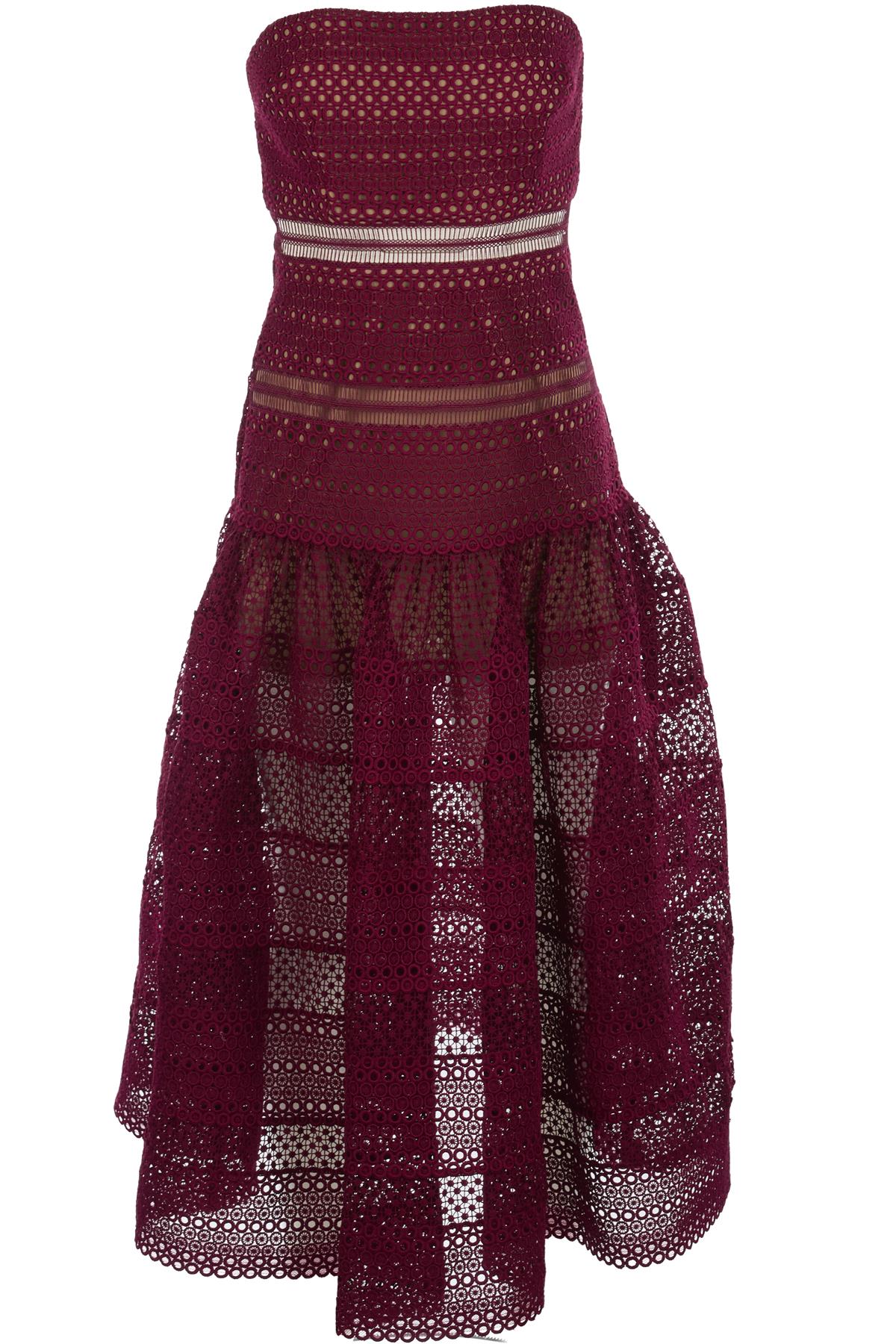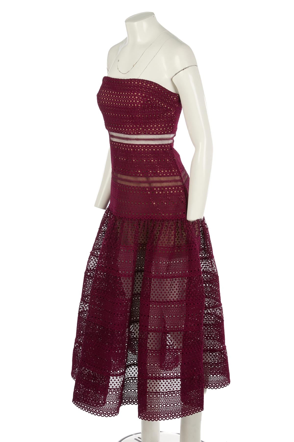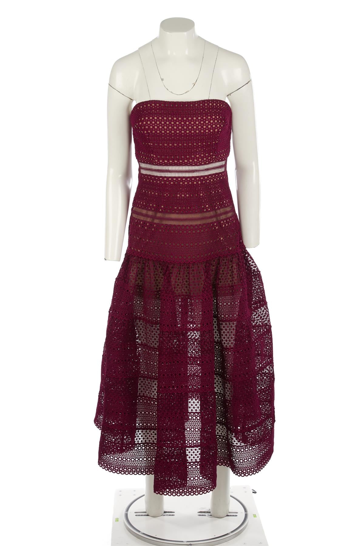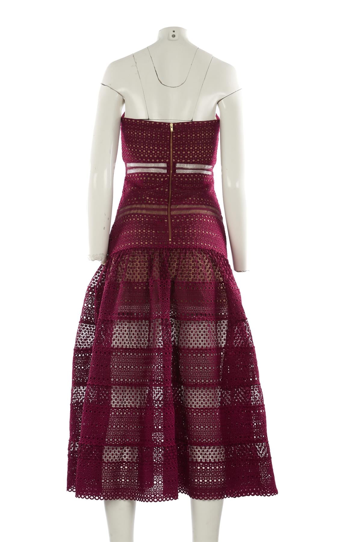 Self-Portrait Burgundy Crochet Maxi Dress. Burgundy. Sleeveless. Sweetheart. Zip fastening - Back. 100% Polyester, 95% Polyester, 5% Spandex. UK 10 (US 6, FR 38, IT 42). Bust: 30 in. Waist: 26 in. Hips: 40 in. Length: 43 in.