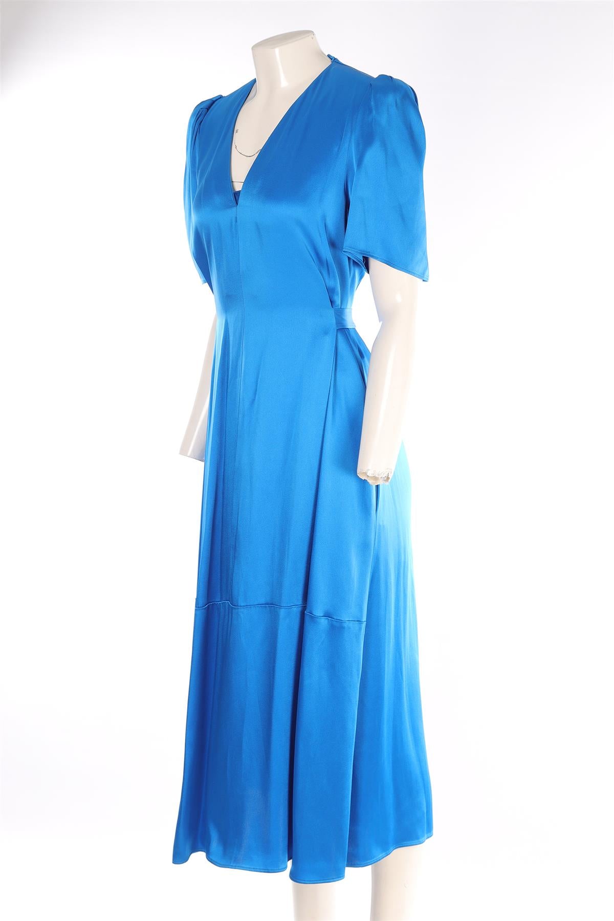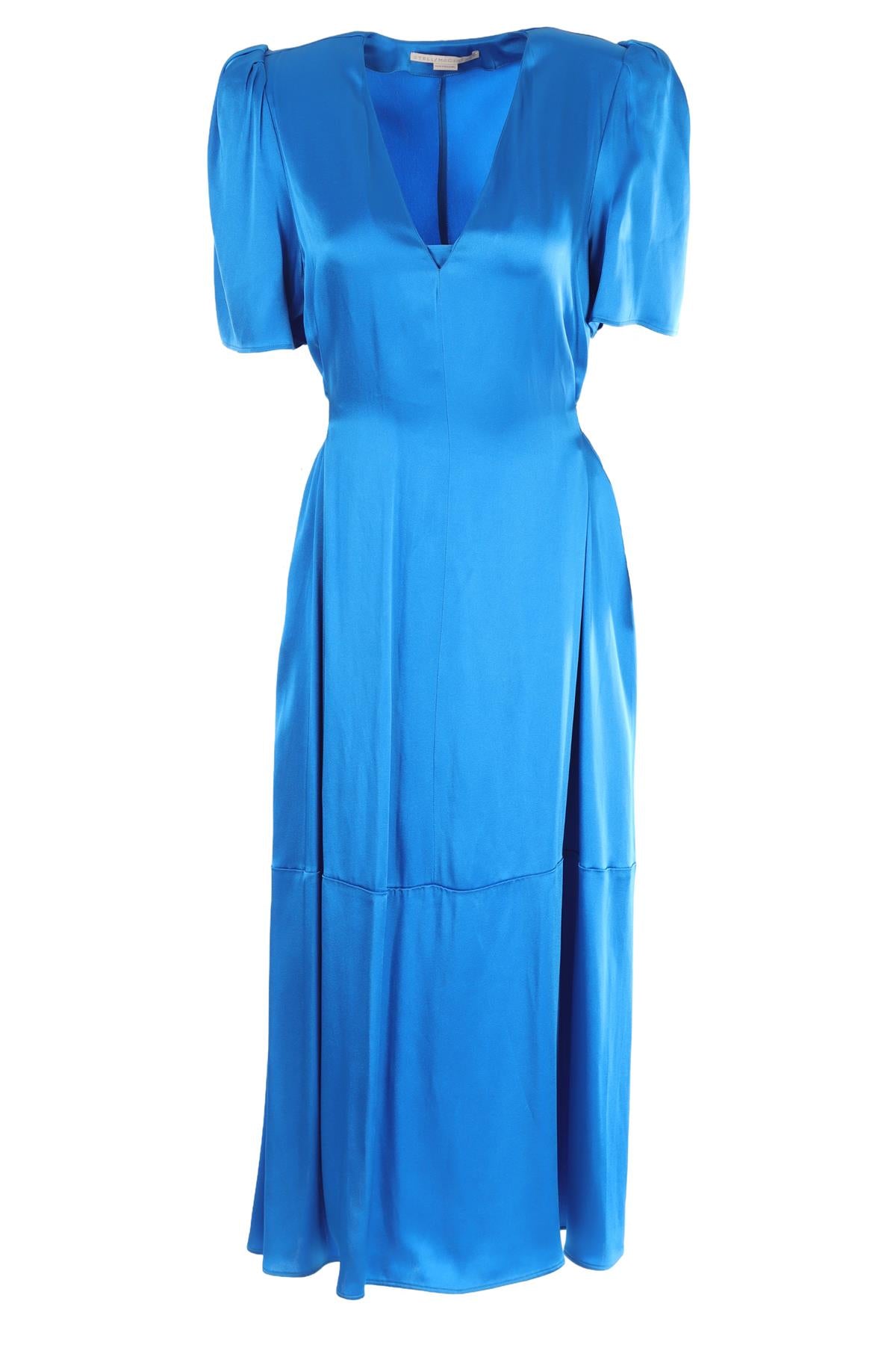Stella Mccartney Blue Satin Maxi Dress. Blue. Short Sleeve. V-Neck. Slips on. 64% Acetate, 36% Viscose. IT 42 (UK 10, US 6, FR 38). Bust: 37 in. Waist: 34 in. Hips: 48 in. Length: 51 in.