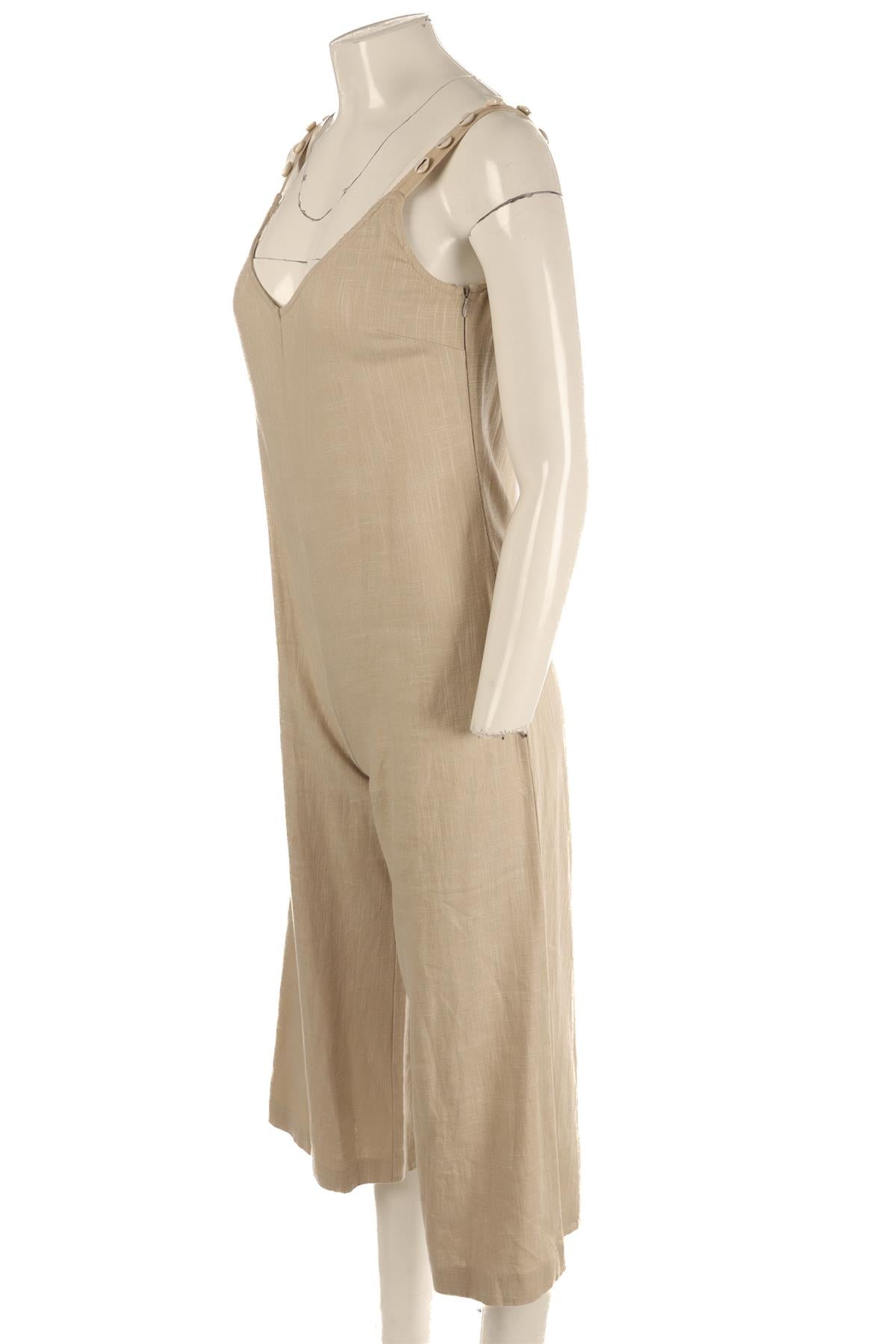Staud Beige Linen Jumpsuit. Beige. Sleeveless. V-Neck. Zip fastening - Side. 55% Linen, 45% Rayon. XSmall (UK 6, US 2, FR 34, IT 38). Bust: 30 in. Waist: 32 in. Hips: 38 in. Length: 46 in. Inseam: 24 in.
