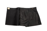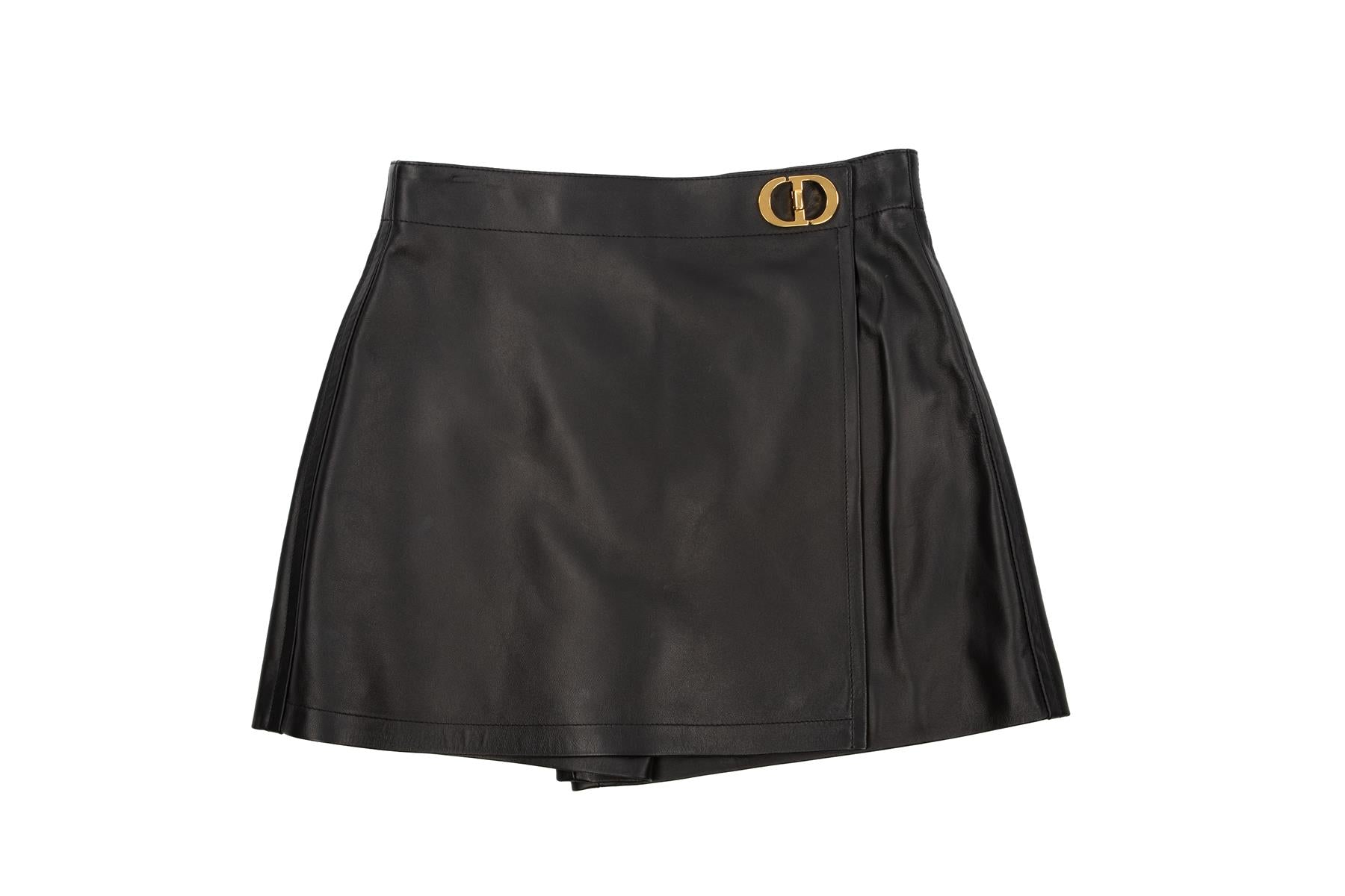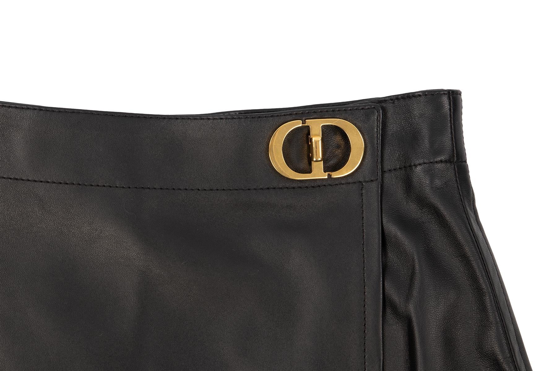 Christian Dior Black Cd Leather Mini Skort. Black. Hook, eye and zip fastening - Front. 100% Lamb leather, 100% Silk. FR 38 (UK 10, US 6, IT 42). Waist: 28 in. Hips: 42 in. Length: 16 in.