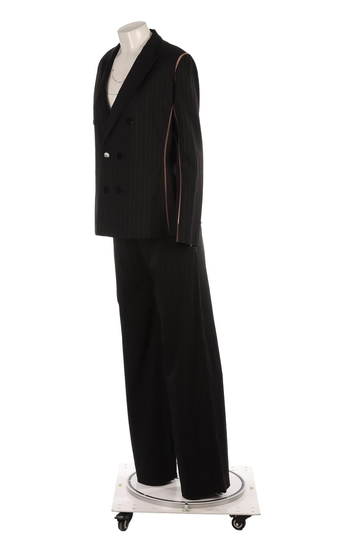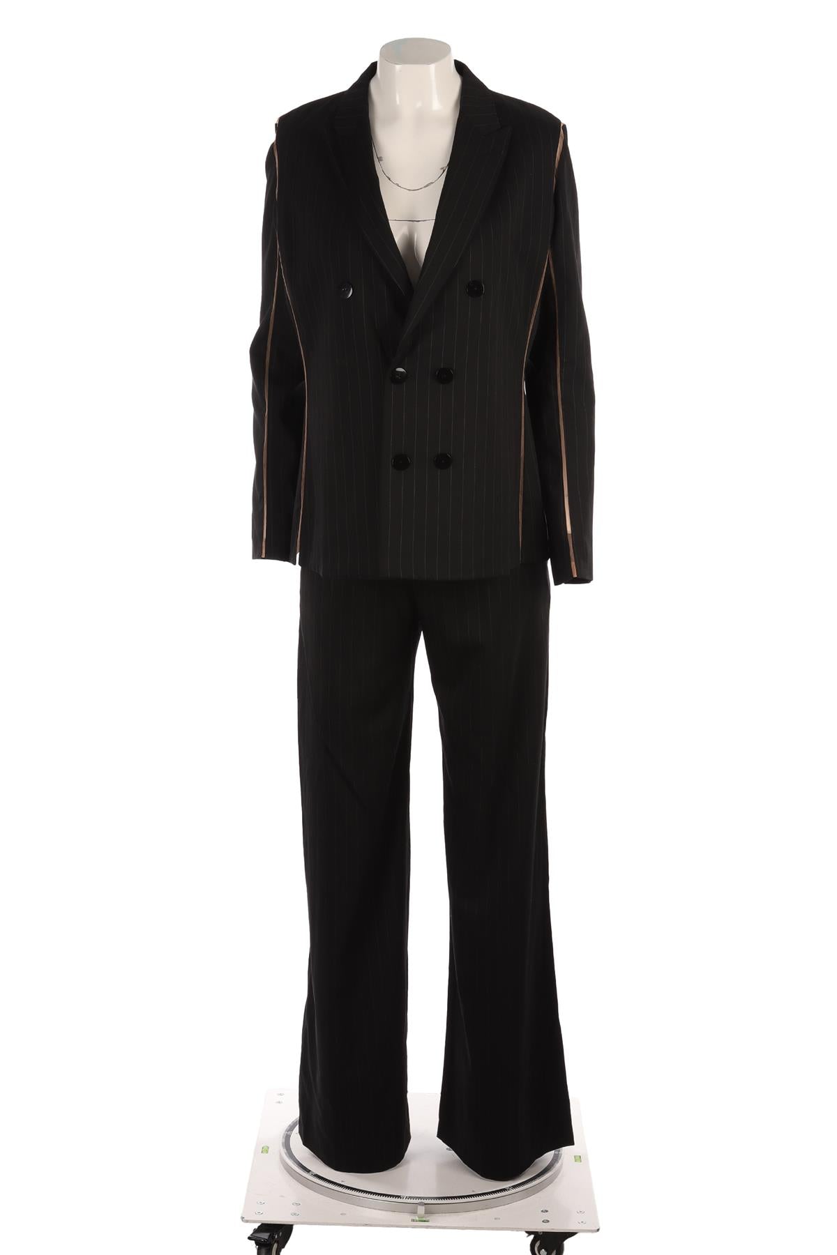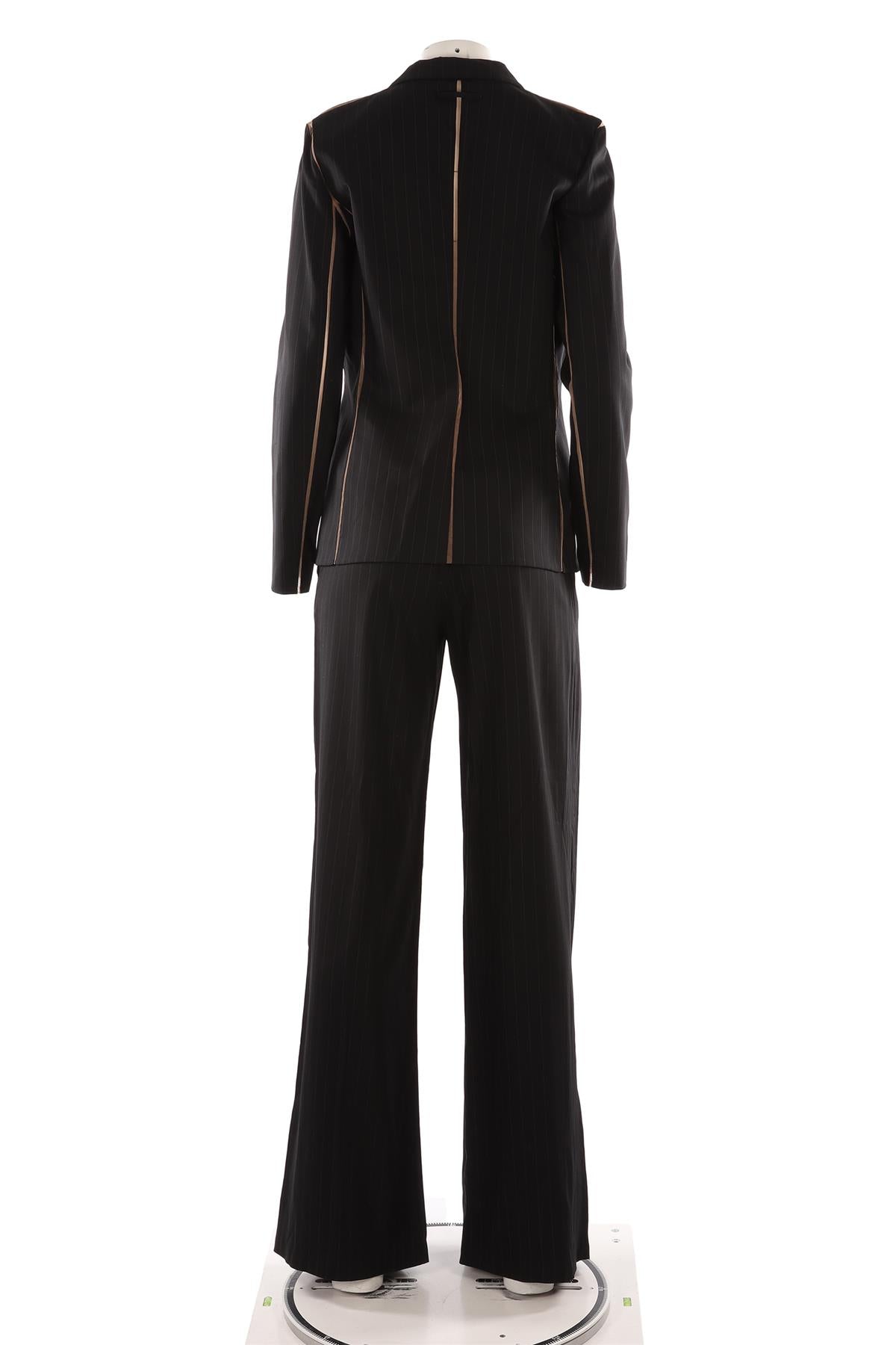 Jean Paul Gaultier Black Vintage Wool 2-Piece Suit. Black. Long Sleeve. V-Neck. Button fastening - Front. 67% Rayon, 29% Wool, 5% Other fibre. IT 44 (UK 12, US 8, FR 40). Bust: 40 in. Waist: 32 in (trousers), 36 in (jacket). Hips: 43 in (trousers), 42 in (jacket). Length: 42.5 in (trousers), 26 in (jacket). Inseam: 34 in. Rise: 9 in.