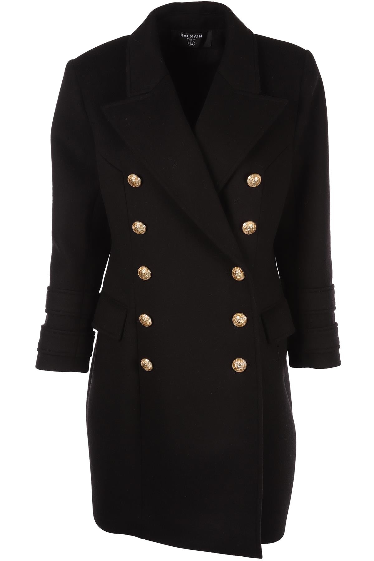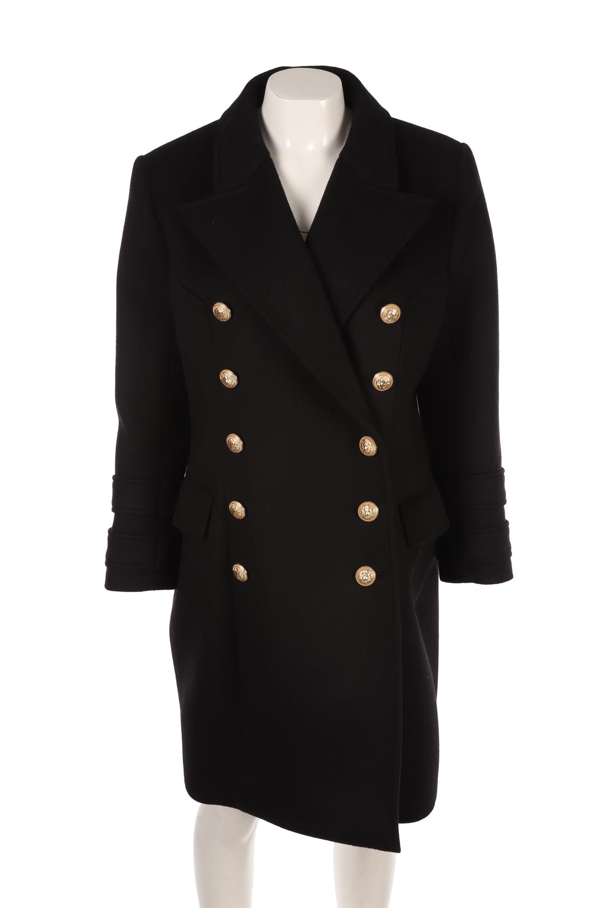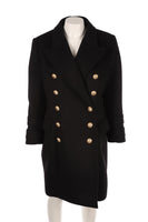 Balmain Black Wool Coat. Black. Long Sleeve. V-Neck. Button fastening - Front. 90% Wool, 10% Cashmere. FR 46 (UK 16, US 12, IT 52). Shoulder to Shoulder: 17 in. Bust: 42 in. Waist: 40 in. Hips: 50 in. Length: 37 in.