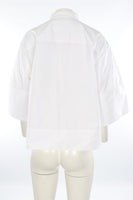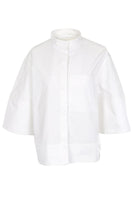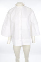 Jil Sander White Cotton Shirt. White. Long Sleeve. Crewneck. Snap button fastening - Front. 100% Cotton. FR 36 (UK 8, US 4, IT 40). Bust: 46 in. Waist: 48 in. Hips: 52 in. Length: 24.5 in.