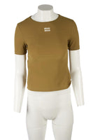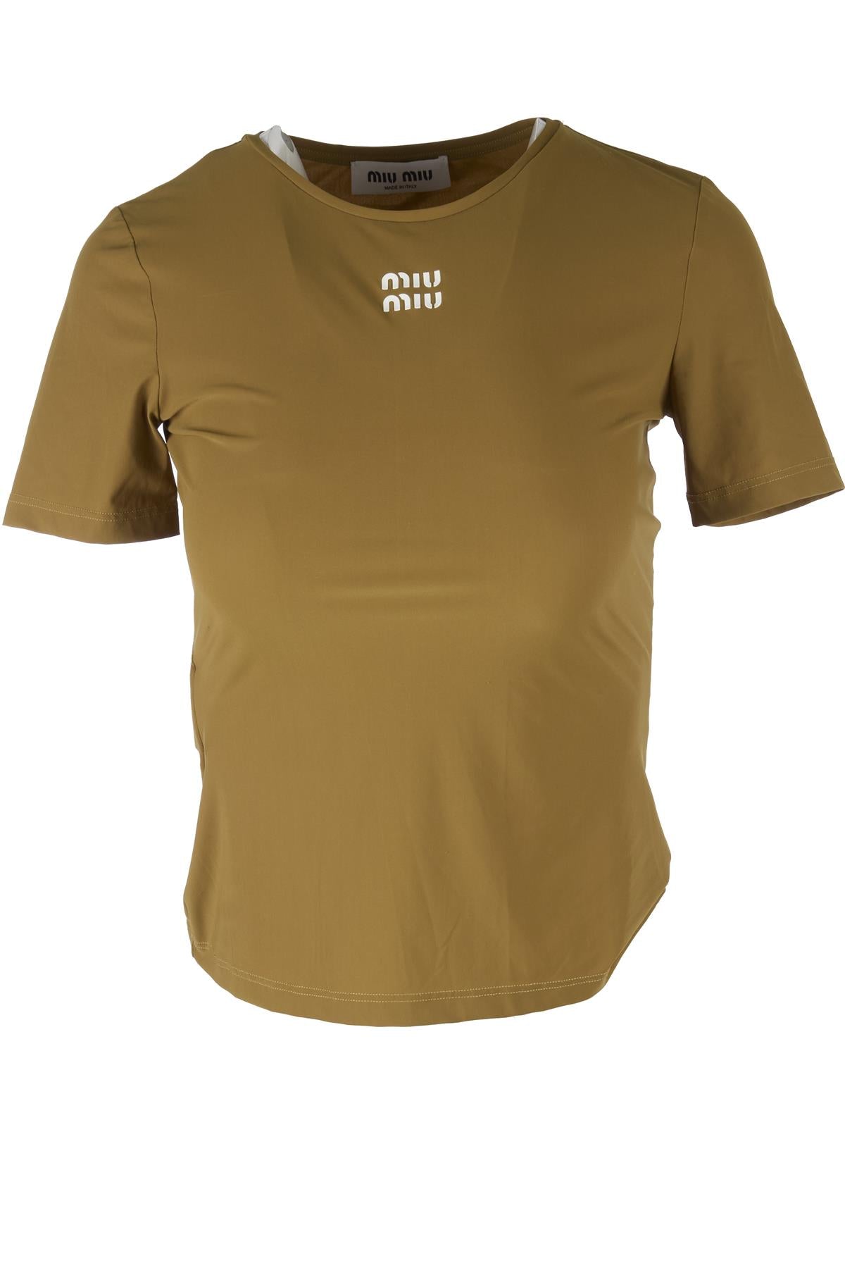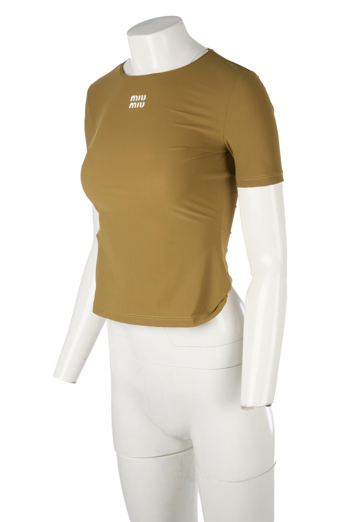 Miu Miu Green Jersey Top. Green. Short Sleeve. Crewneck. Slips on. 73% Recycled Polyamide, 27% Elastane. IT 38 (UK 6, US 2, FR 34). Bust: 29 in. Waist: 27 in. Hips: 30 in. Length: 20 in.