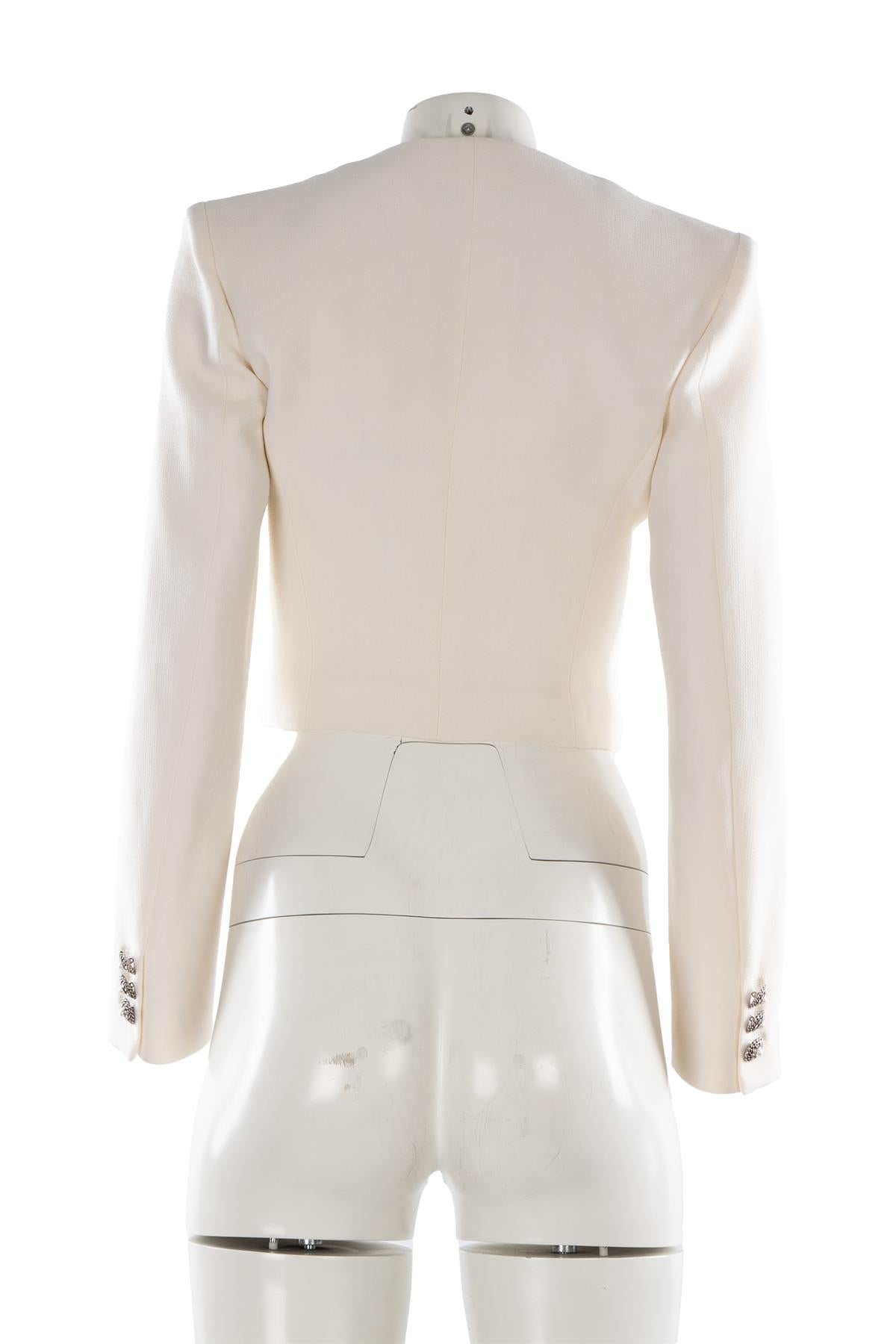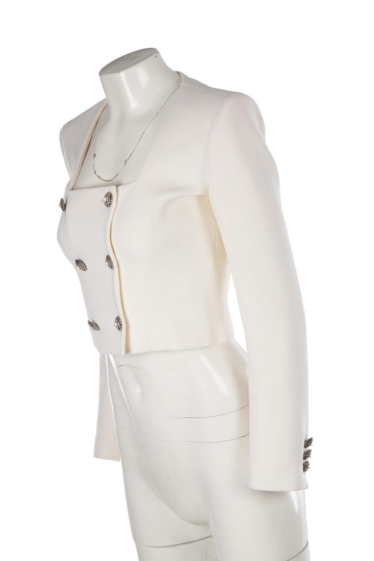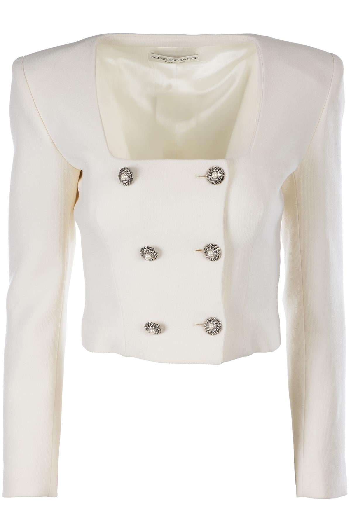 Alessandra Rich Ivory Wool Jacket. Ivory. Long Sleeve. Square Neck. Button fastening - Front. 93% Wool, 5% Polyamide, 2% Elastane, 100% Viscose. IT 40 (UK 8, US 4, FR 36). Bust: 33 in. Waist: 8 in. Hips: 27 in. Length: 17 in.
