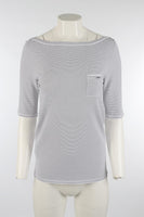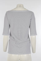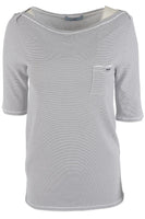 Prada Blue 2025 Knit Top. Black and White. Short Sleeve. Boat Neck. Pull On. 96% Viscose, 4% Polyester. IT 46 (UK 14, US 10, FR 42). Bust: 33 in. Waist: 32 in. Hips: 33 in. Length: 24.5 in.