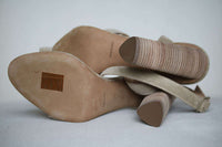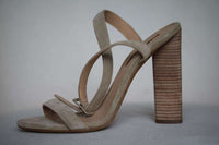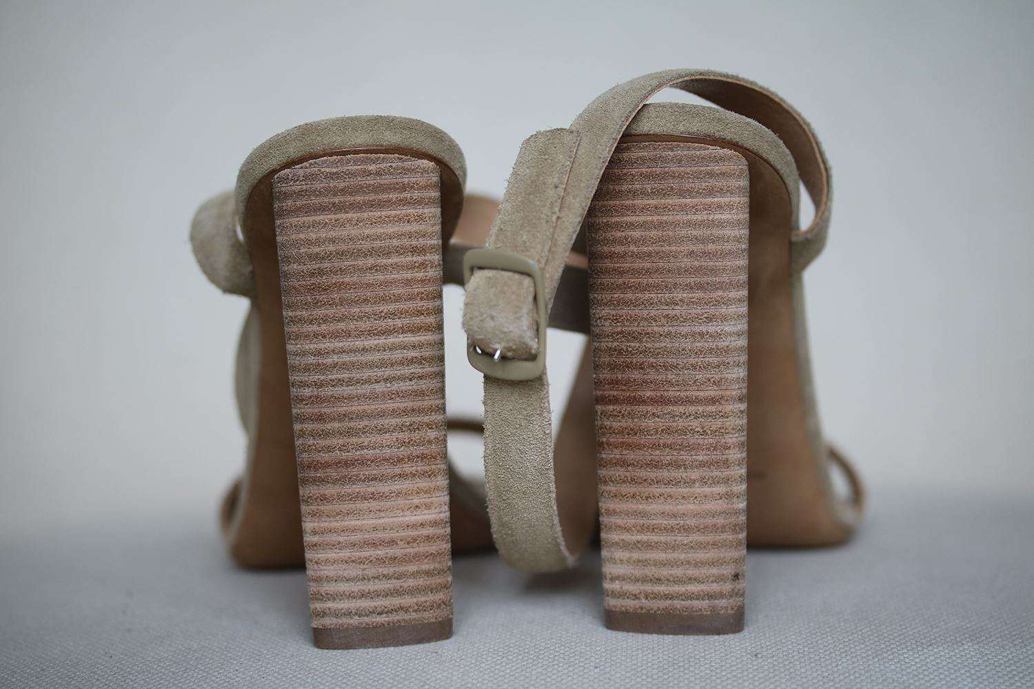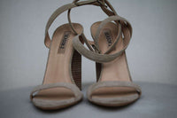 Suede upper with leather sole. Wrap around ankle strap with buckle closure. Heel measures approx 4" / 10 cm.
