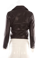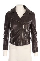 All Saints Black Leather Jacket. Black. Long Sleeve. V-Neck. Zip fastening - Front. 100% Lamb Leather, 100% Polyester. UK 8 (US 4, FR 36, IT 40). Shoulder to Shoulder: 14 in. Bust: 33 in. Waist: 32 in. Hips: 33 in. Length: 19.5 in.