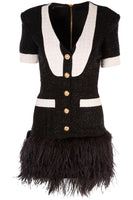 Balmain Black Wool Mini Dress. Black. 49% Wool, 25% Virgin Wool, 14% Polyester, 12% Polyamide, 48% Cotton, 24% Polyamide, 14% Polyethylene, 14% Viscose, 52% Viscose, 48% Cotton, 95% Ostrich Feather, 5% Polyamide. FR 36 (UK 8, US 4, IT 40). Bust: 34 in. Waist: 27 in. Hips: 36 in. Length: 33 in.