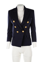 Balmain Navy Wool Blazer. Navy. Long Sleeve. V-Neck. Button fastening - Front. 100% Virgin wool, 52% Viscose, 48% Cotton. FR 36 (UK 8, US 2, IT 40). Shoulder to Shoulder: 14.5 in. Bust: 33 in. Waist: 28 in. Hips: 34 in. Length: 23 in.