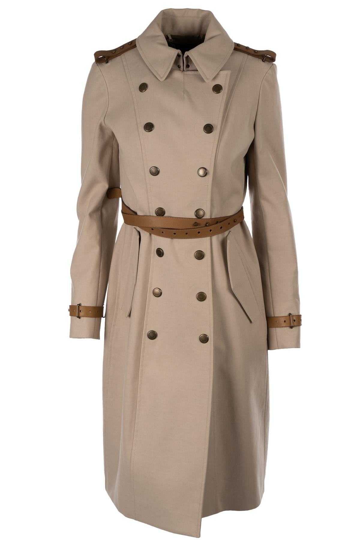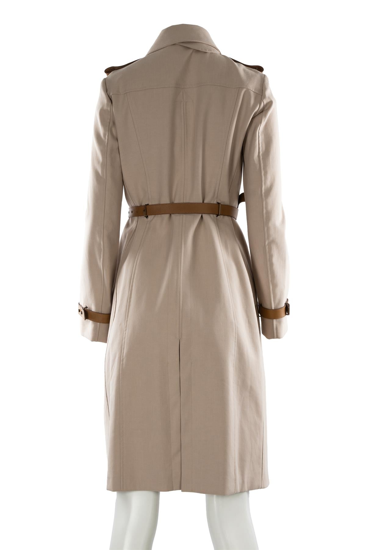 Burberry Prorsum Taupe Cotton Trench Coat. Taupe. Long Sleeve. Mock Neck. Snap button fastening - Front. 100% Cotton, 100% Leather. IT 40 (UK 8, US 4, FR 36). Shoulder to Shoulder: 15 in. Bust: 37 in. Waist: 32 in. Hips: 49 in. Length: 40 in.