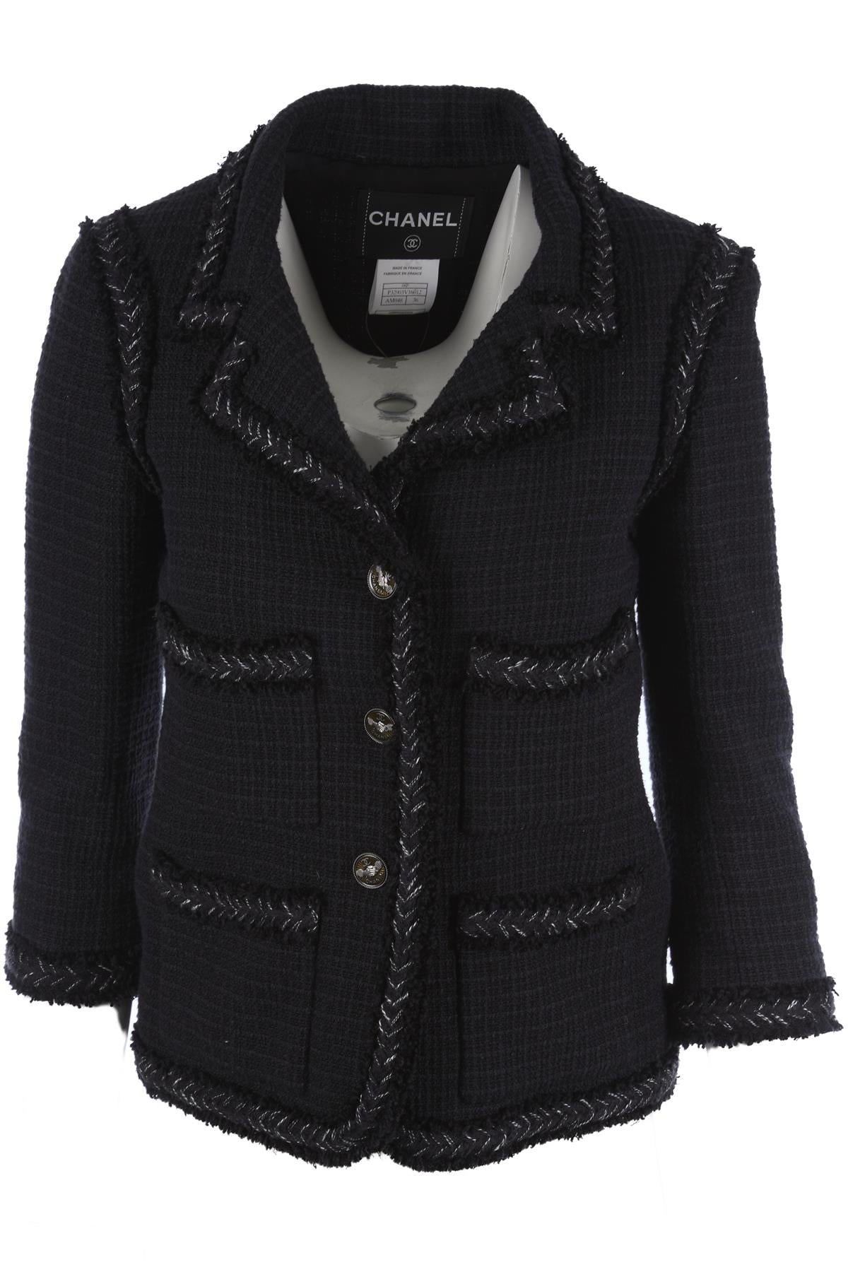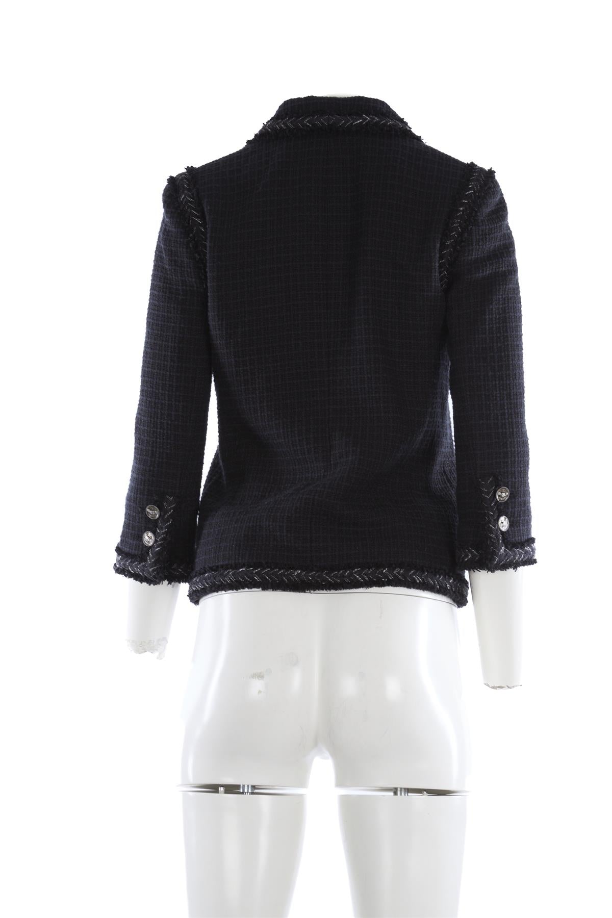Chanel Black 2008 Cotton Blazer. Black. Long Sleeve. V-Neck. Button fastening - Front. 54% Cotton, 23% Silk, 18% Linen, 5% Polyamide, 100% Silk. FR 36 (UK 8, US 4, IT 40). Shoulder to Shoulder: 15 in. Bust: 35 in. Waist: 34 in. Hips: 36 in. Length: 19 in.