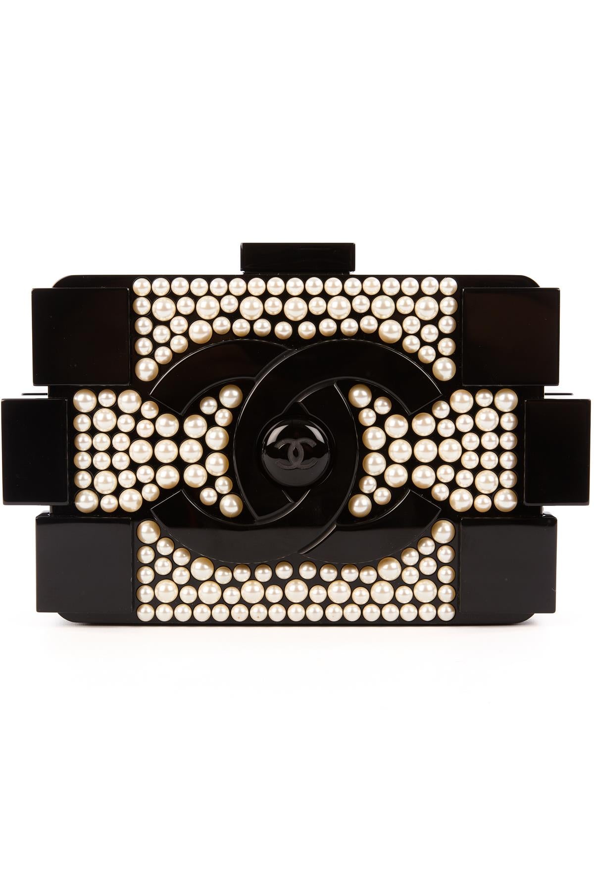 Chanel Black 2014 Boy Brick Lego Pearl Clutch. Black. Magnetic fastening - Top. Does not come with - authenticity card, dustbag or box. Lego. Height: 4.7 in. Width: 6.5 in. Depth: 1.8 in. Strap drop: 24.5 in.
