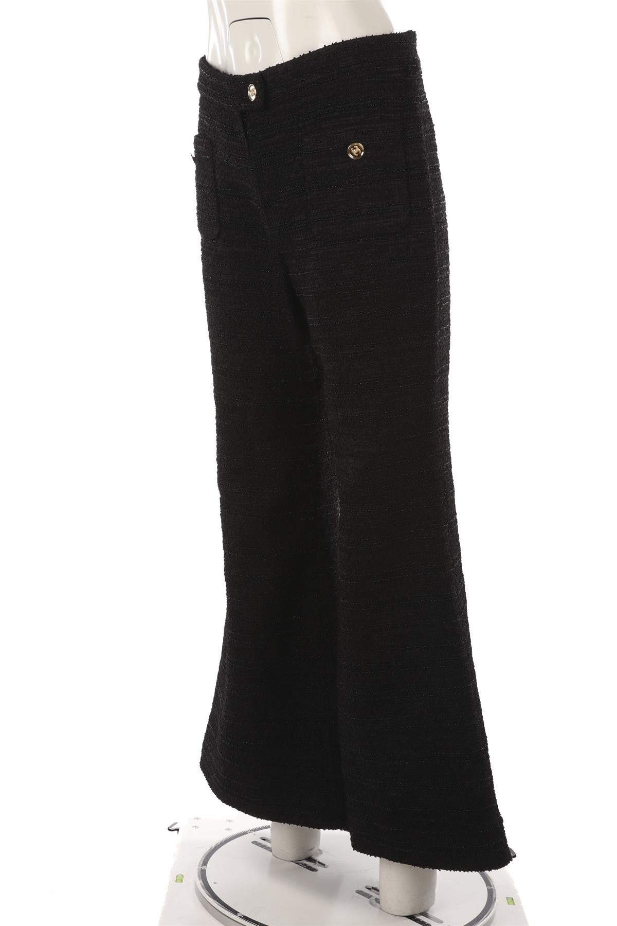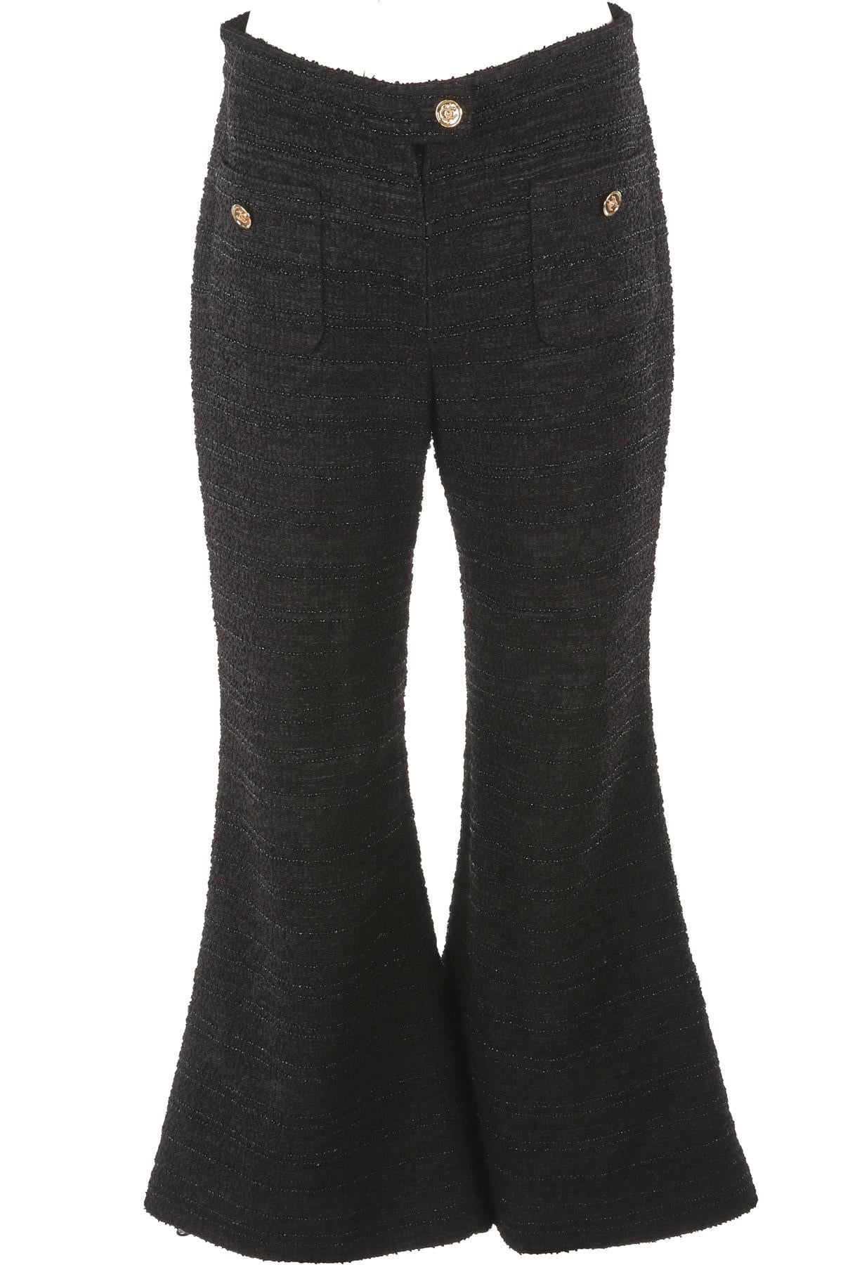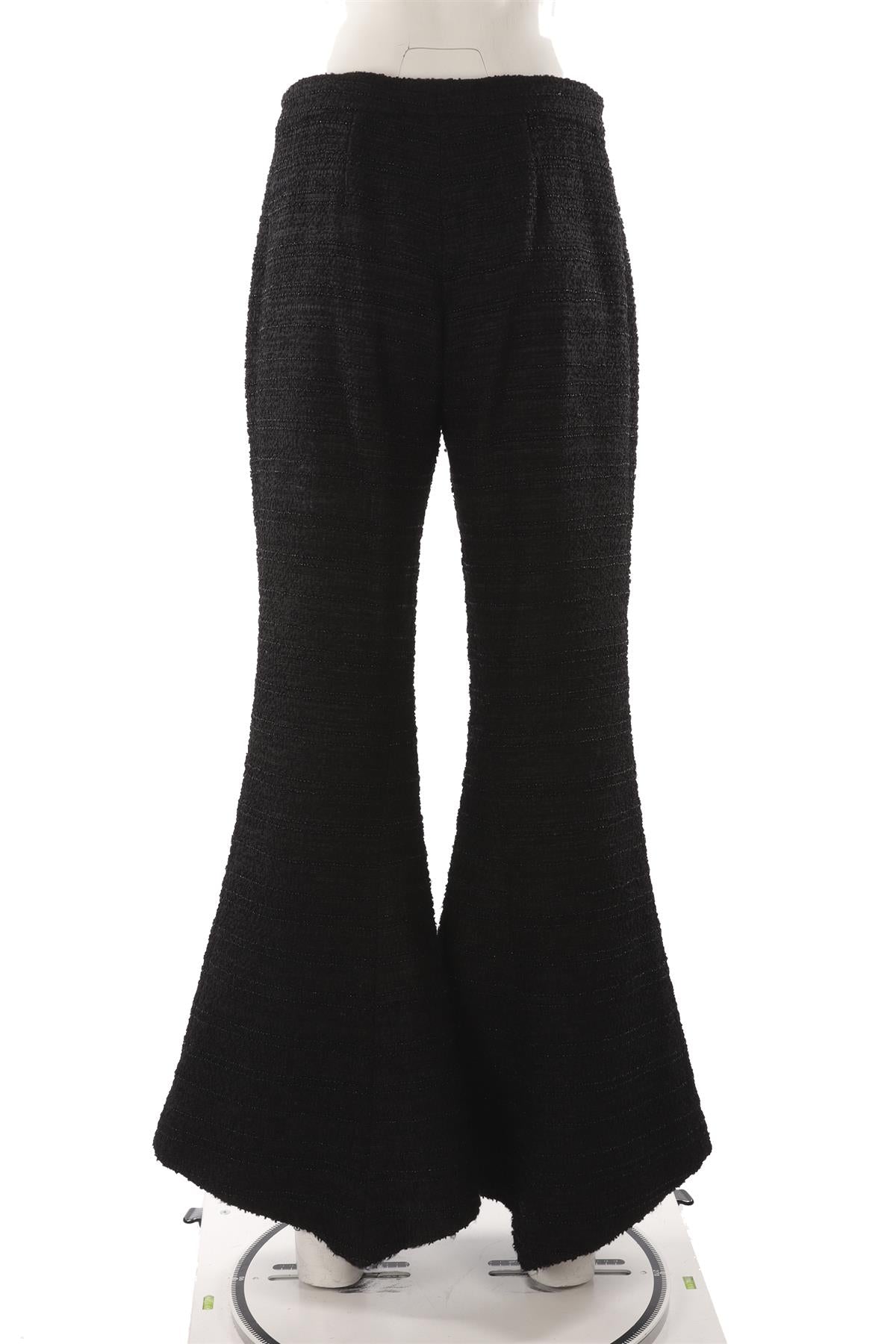 Chanel Black 2023 Tweed Flared Pants. Black. Pull on. 43% Polyester, 29% Viscose, 22% Polyamide, 6% Cotton. FR 40 (UK 12, US 8, IT 44). Waist: 32 in. Hips: 38 in. Length: 40 in. Inseam: 33.5 in.
