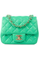 Chanel Green 2019 Classic Square Mini Quilted Leather Shoulder Bag. Green. Twist lock fastening - Front. Does not come with - dustbag or box. Height: 5 in. Width: 6.5 in. Depth: 3 in. Strap drop: 21 in.