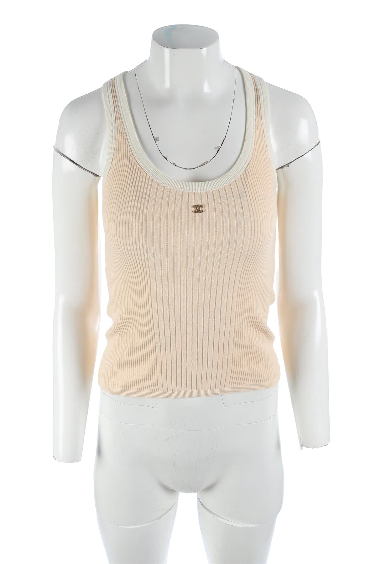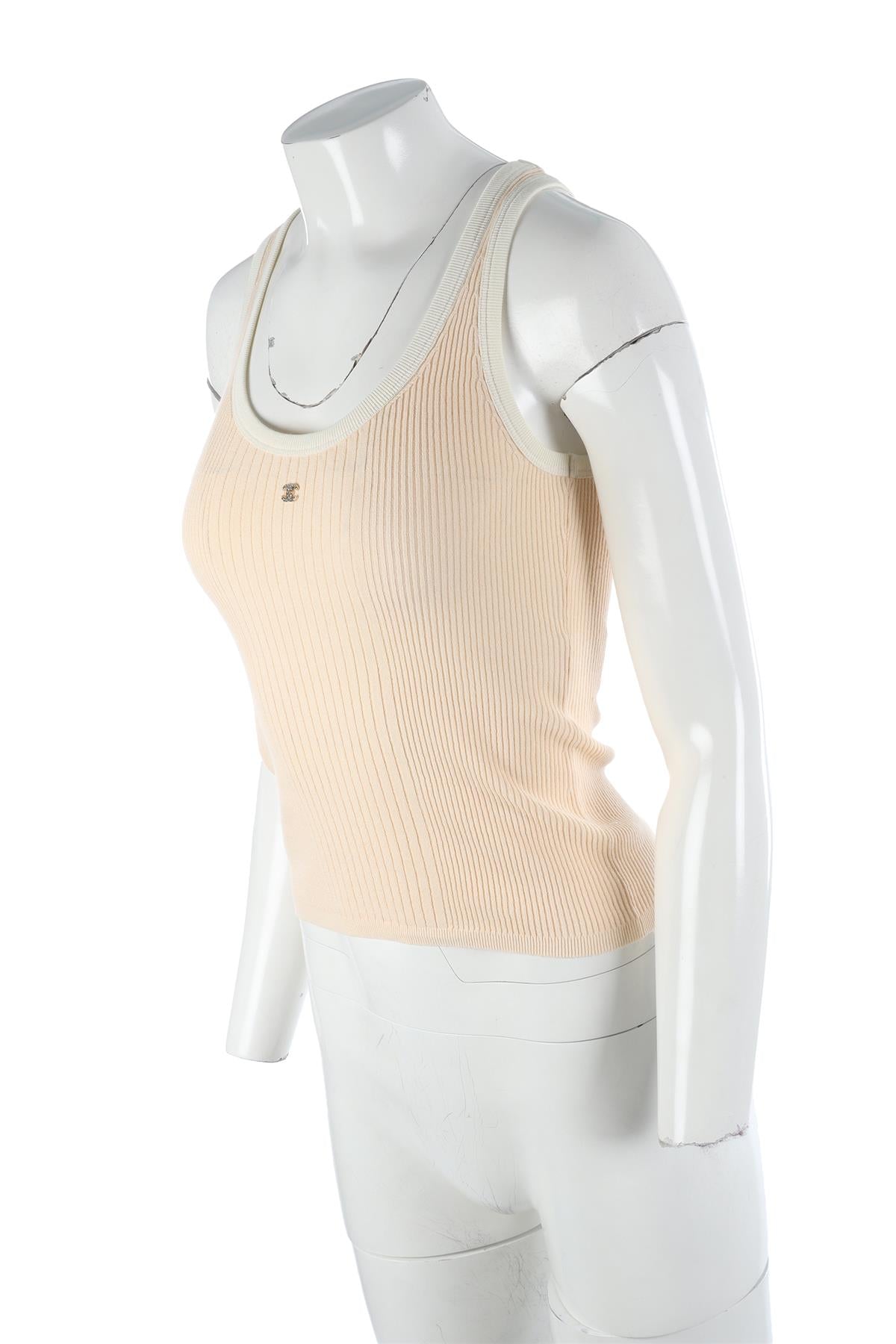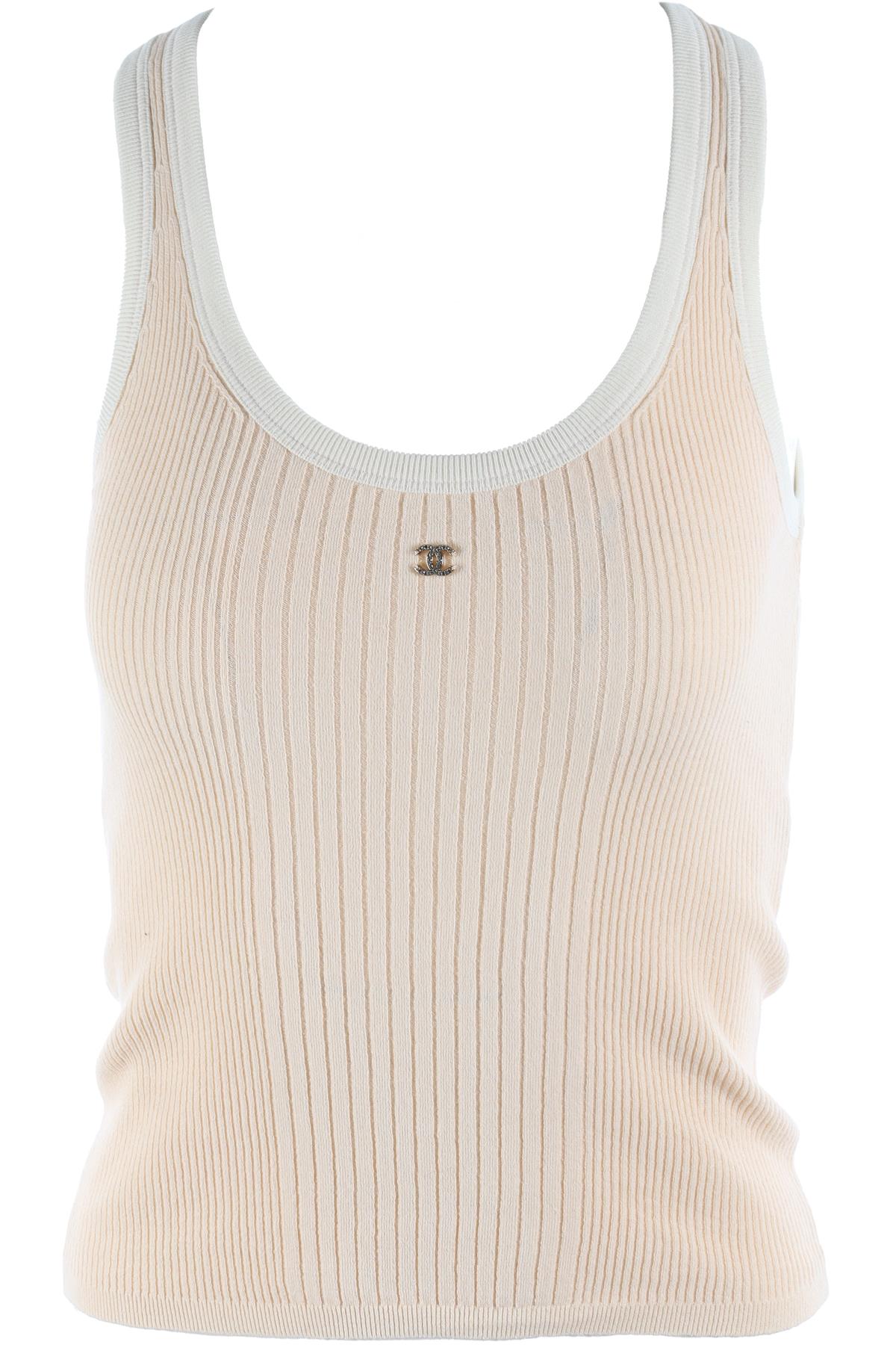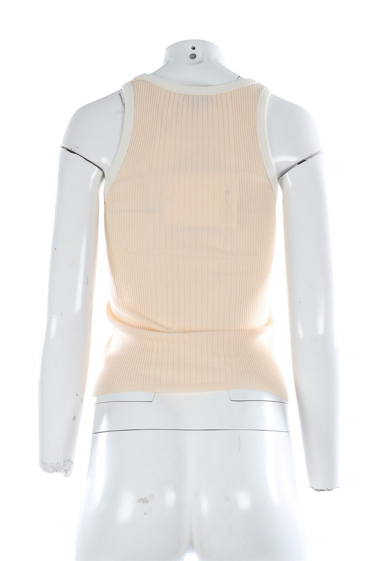 Chanel Peach 2025 Cotton Top. Cream. Sleeveless. Scoop Neck. Pull on. 98% Cotton, 1% Polyamide, 1% Elastane. FR 34 (UK 6, US 2, IT 38). Bust: 23 in. Waist: 22 in. Hips: 22 in. Length: 20.5 in.