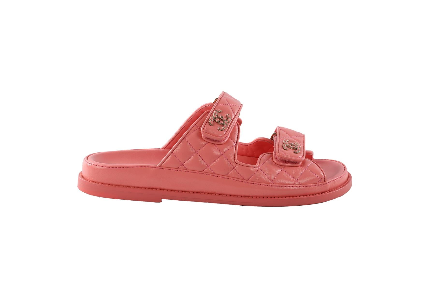 Chanel Pink 2024 Dad Quilted Leather Sandals. Peach. Slips on. Does not come with - dustbag or box. EU 38.5 (UK 5.5, US 8.5). Insole: 10 in. Heel Height: 1.2 in.