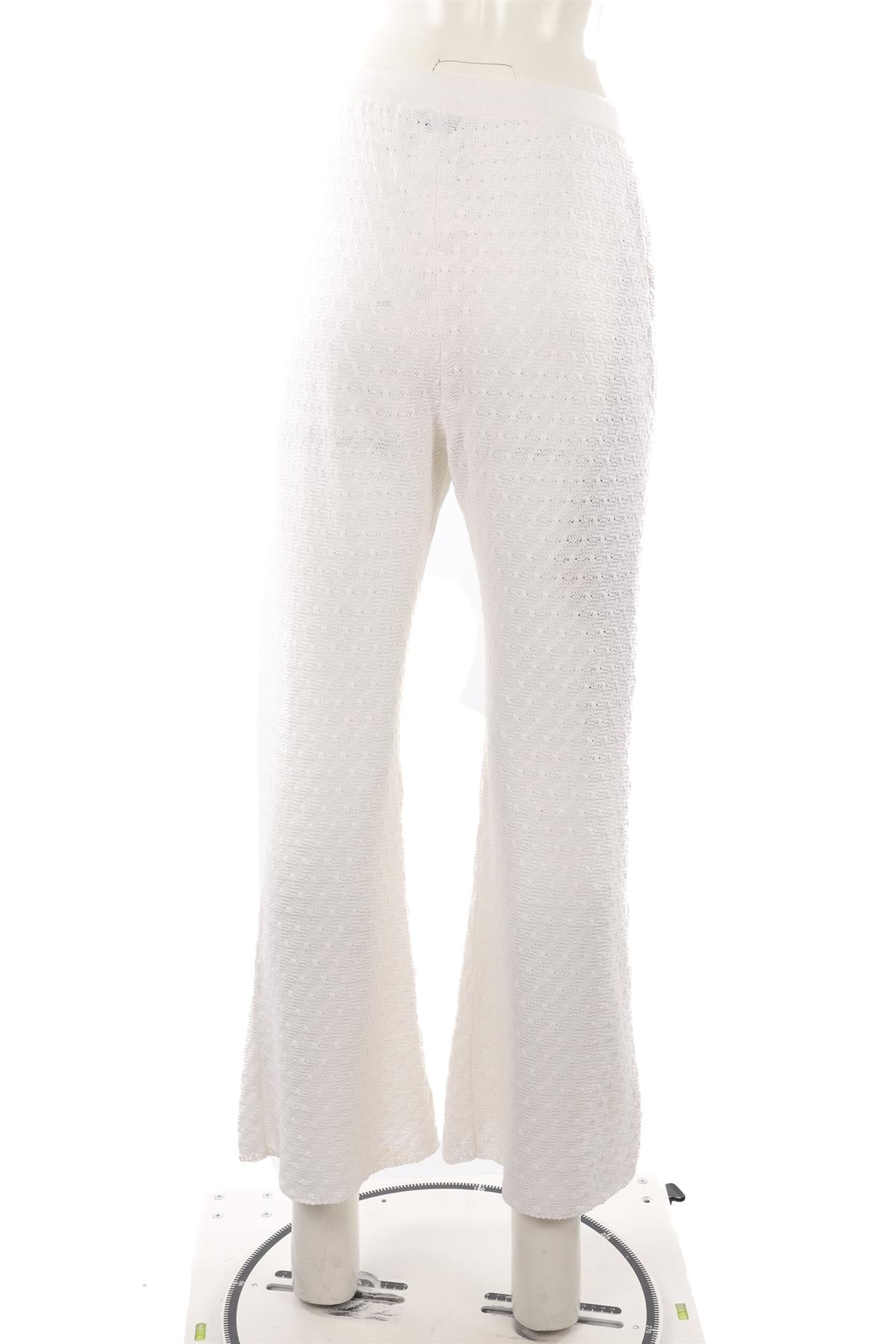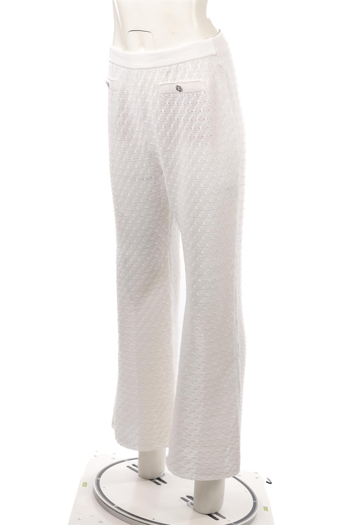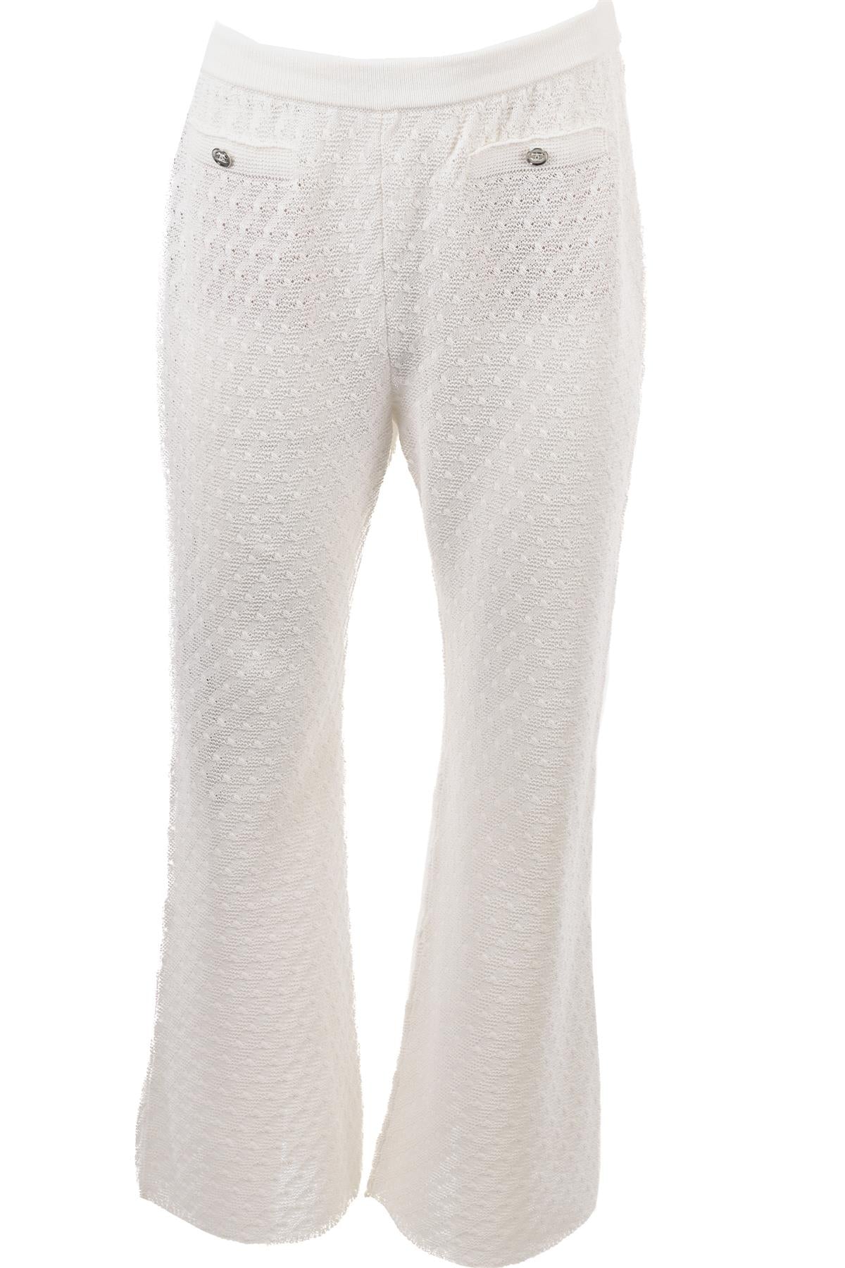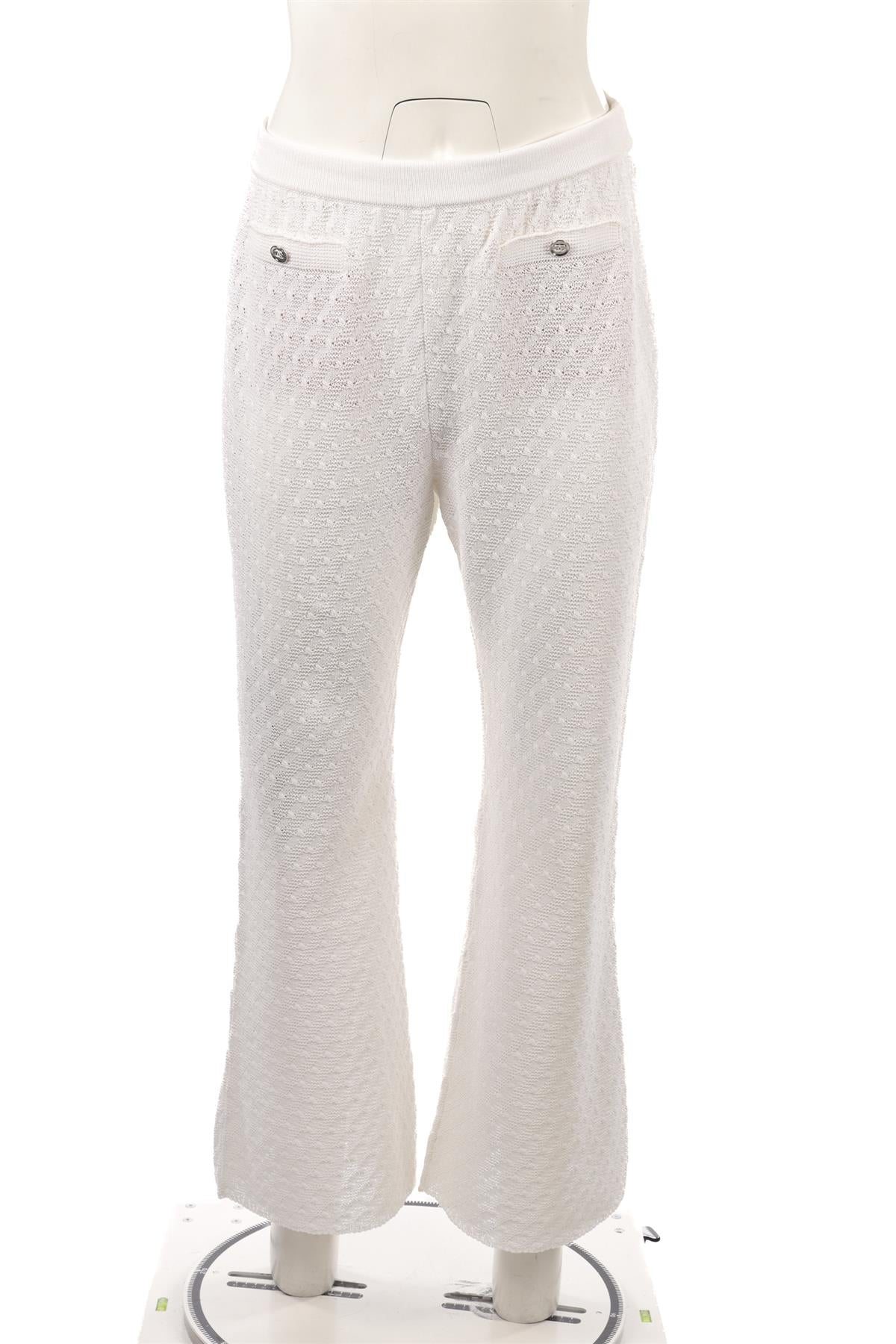 Chanel White 2023 Cotton Flared Pants. White. Pull on. 100% Cotton. FR 40 (UK 12, US 8, IT 44). Waist: 28 in. Hips: 40 in. Length: 40.5 in. Inseam: 31 in.