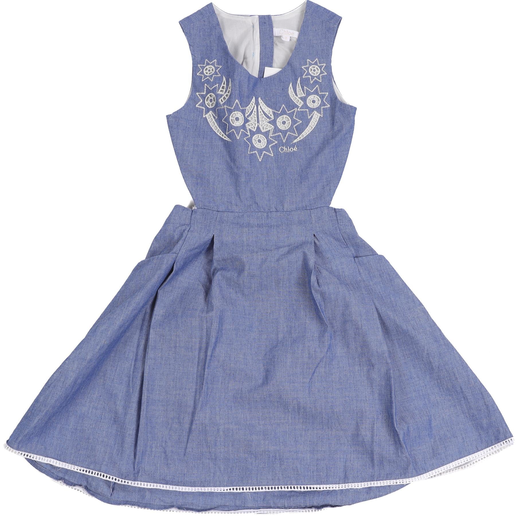 Chloé Blue Kids Girls Dress. Blue and white. Sleeveless. Crewneck. Button fastening - Back. 100% Cotton. 8 Years.