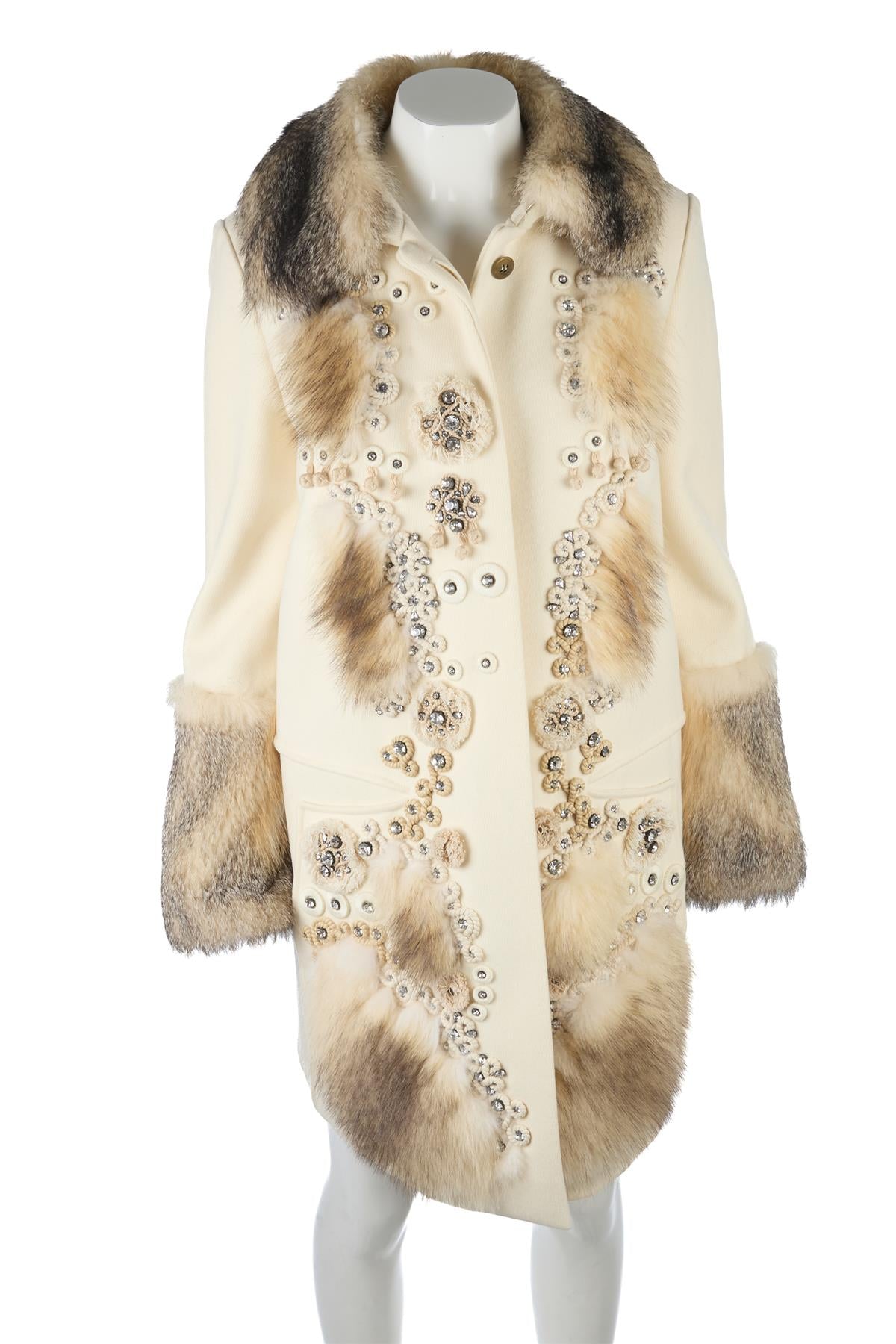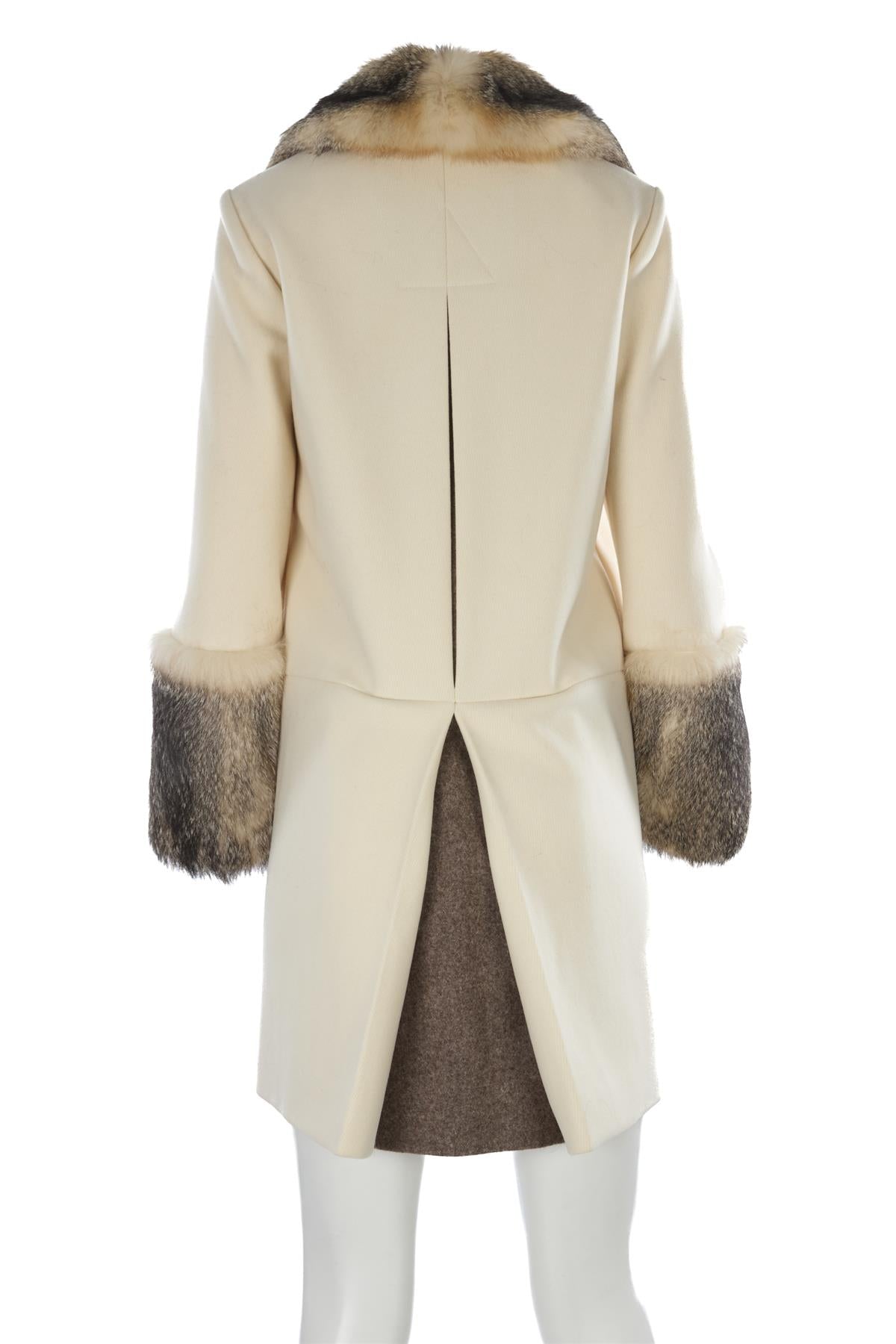 Chloé Cream 2008 Fox Fur And Wool Coat. Cream. Long Sleeve. Crewneck. Button fastening - Front. 100% Wool, 100% Fox fur. FR 36 (UK 8, FR 4, IT 40). Shoulder to Shoulder: 15.5 in. Bust: 34 in. Waist: 40 in. Hips: 44 in. Length: 37.5 in.