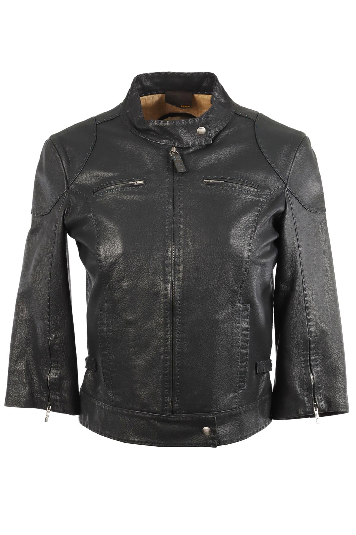 Fendi Grey Vintage Leather Jacket. Grey. Long Sleeve. Crewneck. Zip fastening - Front. 100% Vera Pelle, 100% Lino-flax. IT 40 (UK 8, US 4, FR 36). Shoulder to Shoulder: 17 in. Bust: 38 in. Waist: 36 in. Hips: 34 in. Length: 21 in.