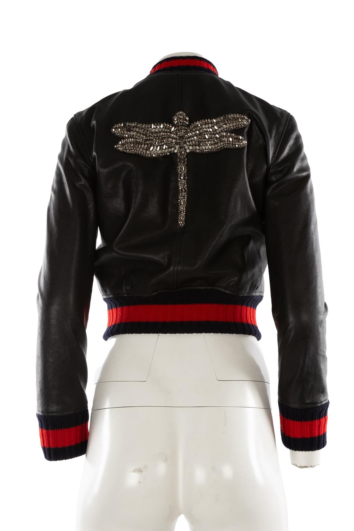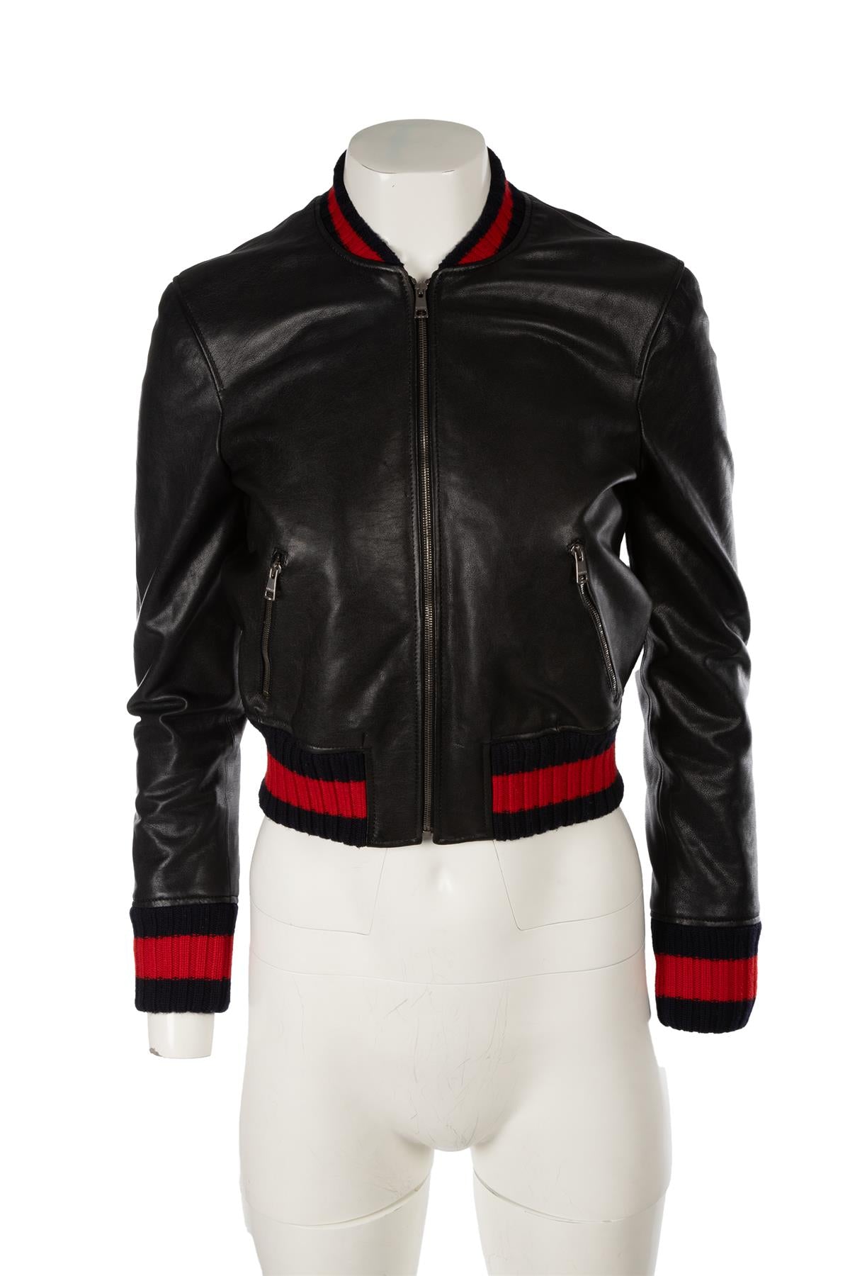 Gucci Black Leather Jacket. Black. Long Sleeve. Mock Neck. Zip fastening - Front. Genuine leather, 96% Wool, 3% Polyamide, 1% Elastane. IT 36 (UK 4, US 0, FR 32). Bust: 36 in. Waist: 34 in. Hips: 20 in. Length: 18 in.