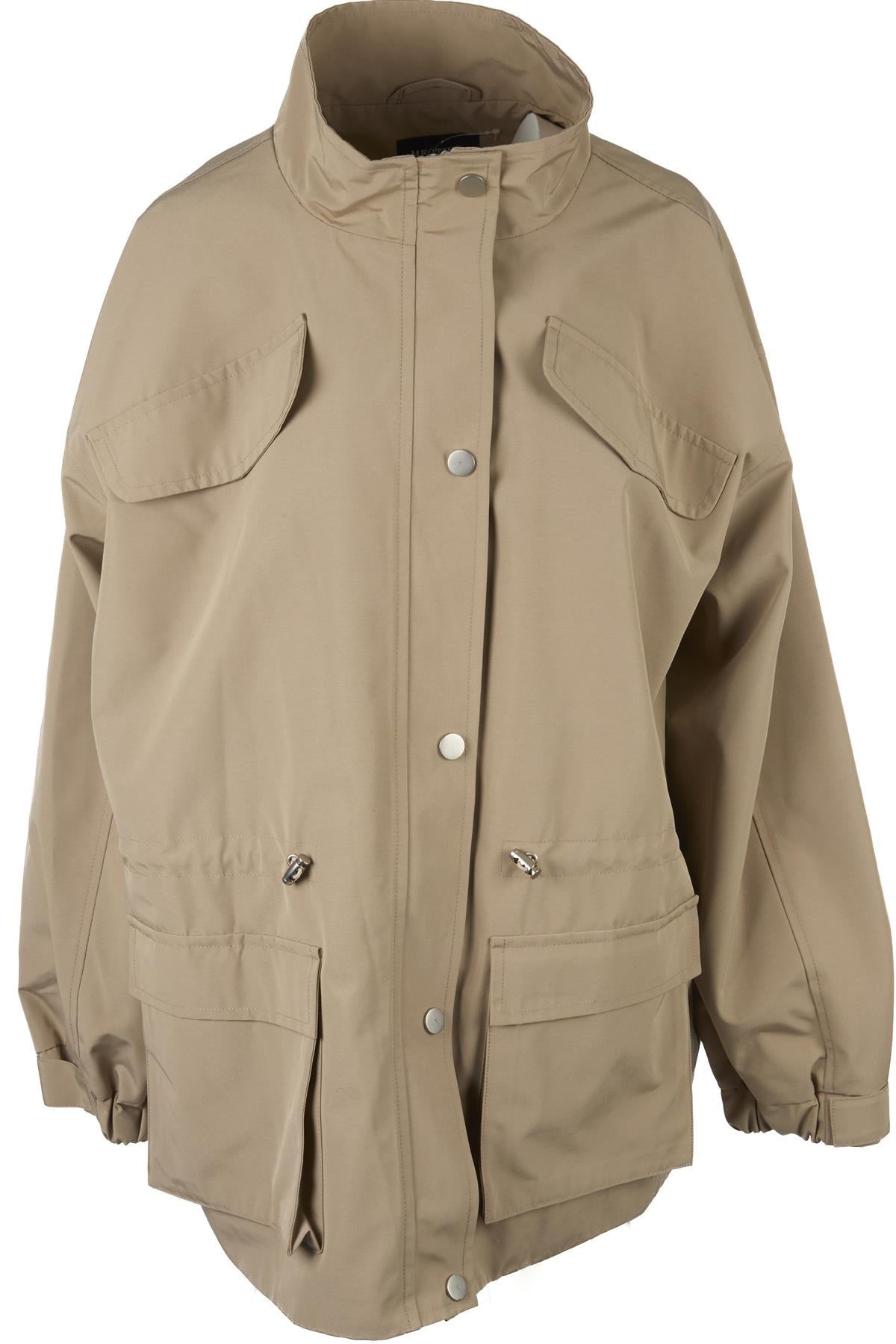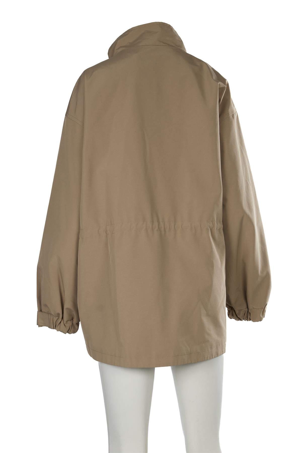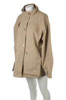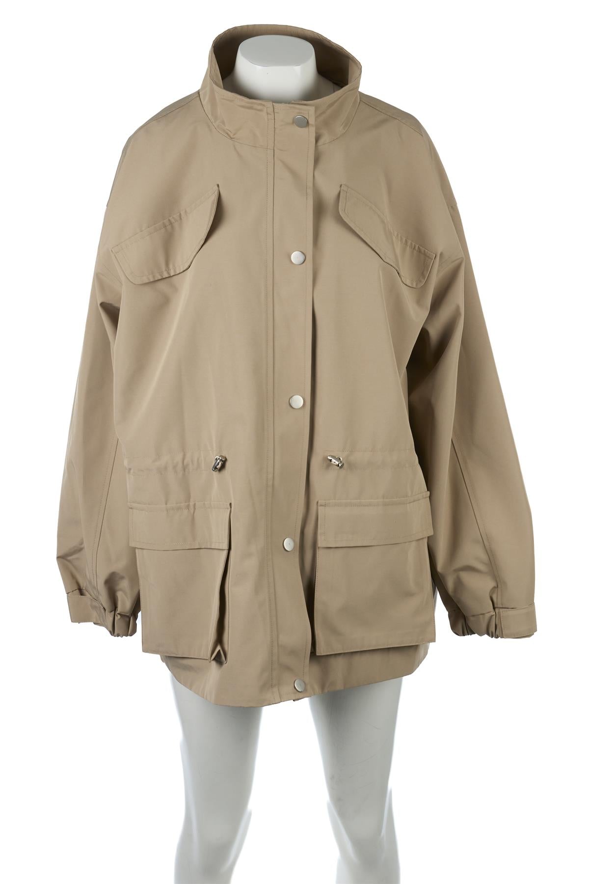 Meotine Beige Tracey Cotton Jacket. Beige. Long Sleeve. Mock Neck. Button fastening - Front. 100% Polyester, 90% Polyester, 10% Elastane. XSmall (UK 6, US 2, FR 34, IT 38). Shoulder to Shoulder: 23.5 in. Bust: 52 in. Waist: 53 in. Hips: 54 in. Length: 32 in.