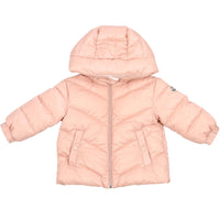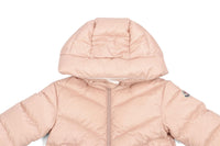 Moncler Pink Baby Girls Jacket. Pink and white. Long Sleeve. Crewneck. Zip fastening - Front. 100% Polyamide, 100% Cotton, 90% Goose down, 10% Feather. 12-18 Months.
