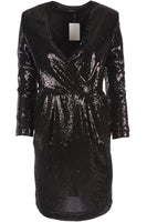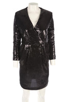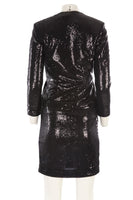 P.A.R.O.S.H Black Sequin Mini Dress. Black. Long Sleeve. V-Neck. Zip fastening - Side. 85% Polyester, 15% Polaymide, 95% Polyester, 5% Elastane. XSmall (UK 6, US 2, FR 34, IT 38). Bust: 30 in. Waist: 28 in. Hips: 33 in. Length: 37 in.