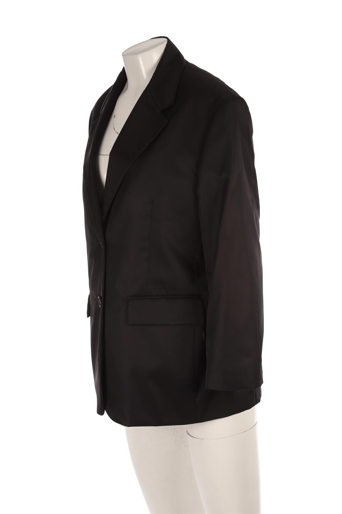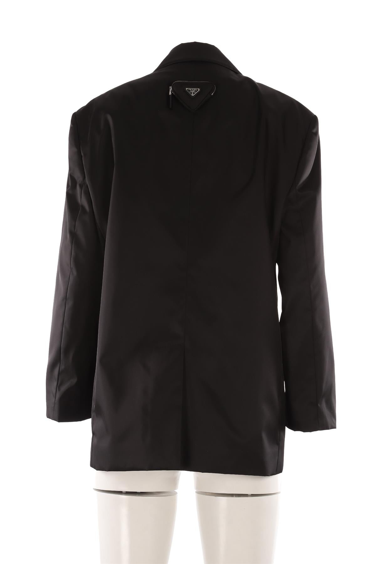 Prada Black Nylon Blazer. Black. Long Sleeve. V-Neck. Button fastening - Front. 100% Polyamide, 100% Viscose. IT 42 (UK 10, US 6, FR 38). Bust: 44 in. Waist: 42 in. Hips: 45 in. Length: 29 in.