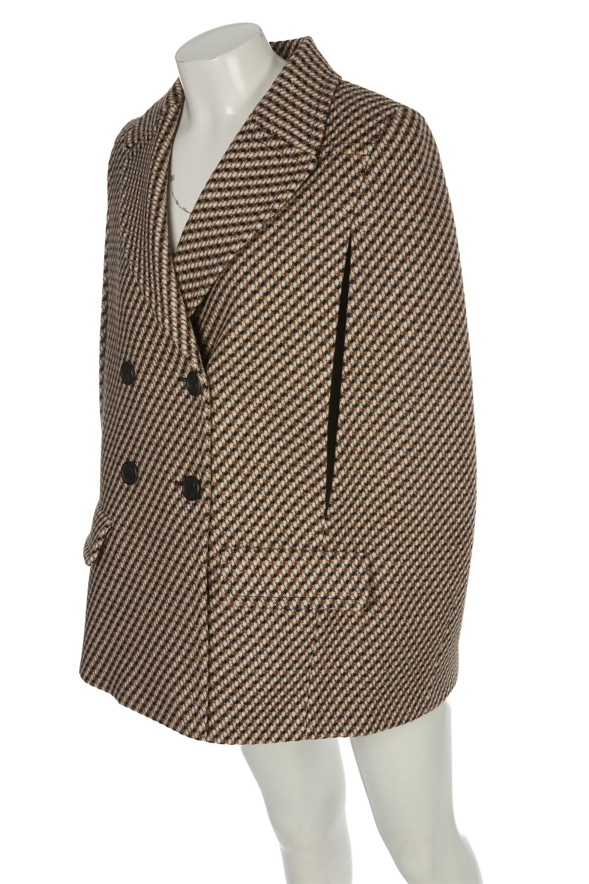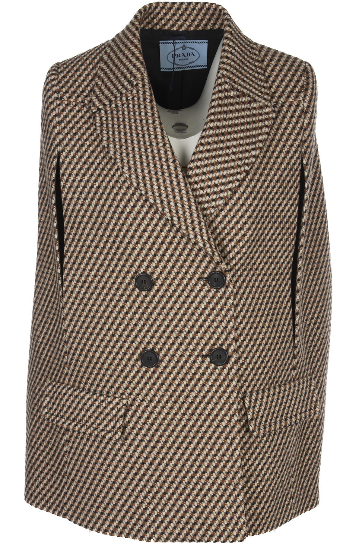 Prada Brown 2014 Wool Cape. Brown, cream and black. Sleeveless. Crewneck. Button fastening - Front. 92% Virgin wool, 7% Angora, 1% Elastane, 66% Viscose, 34% Silk, 100% Polyamide. IT 40 (UK 8, US 4, FR 36). Shoulder to Shoulder: 15 in. Bust: 44 in. Waist: 46 in. Hips: 48 in. Length: 31 in.