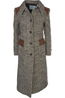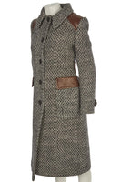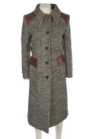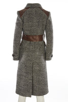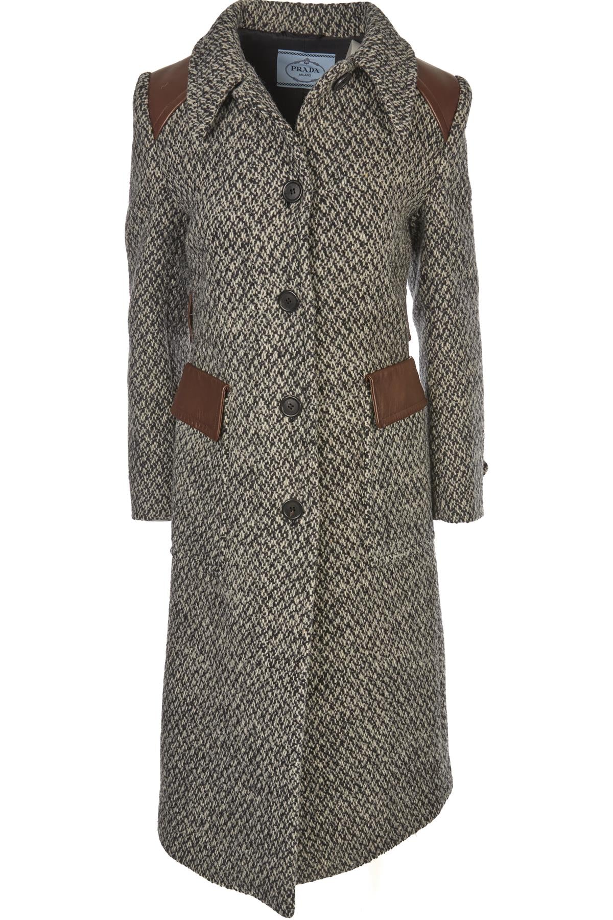 Prada Grey 2014 Wool Coat. Grey and brown. Long Sleeve. Crewneck. Button fastening - Front. 99% Virgin wool, 1% Polyamide, 66% Viscose, 34% Silk, 100% Polyester, 100% Lamb skin. IT 40 (UK 8, US 4, FR 36). Shoulder to Shoulder: 16 in. Bust: 34 in. Waist: 34 in. Hips: 38 in. Length: 46 in.