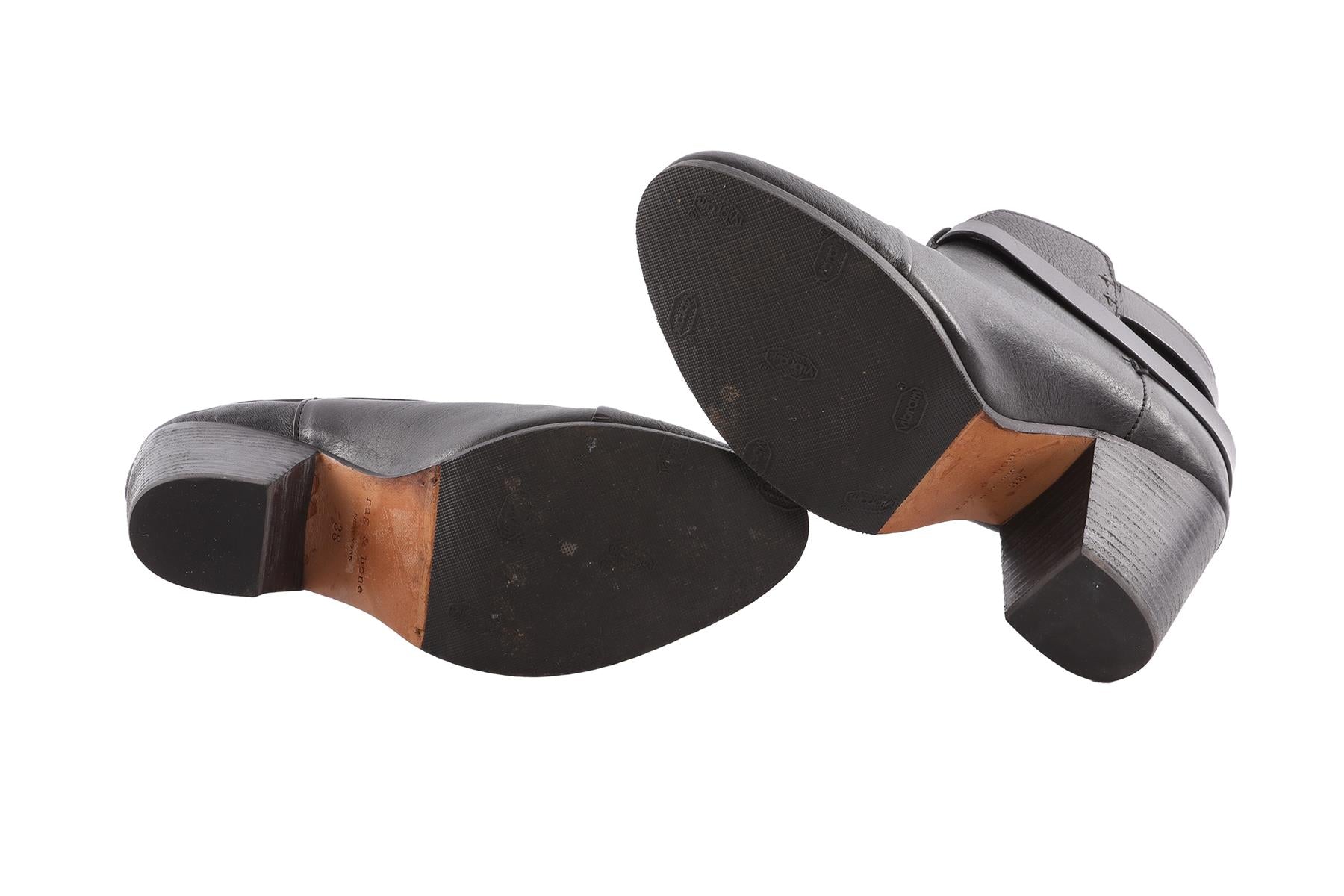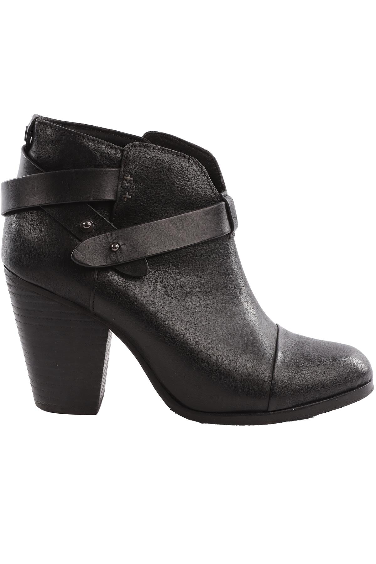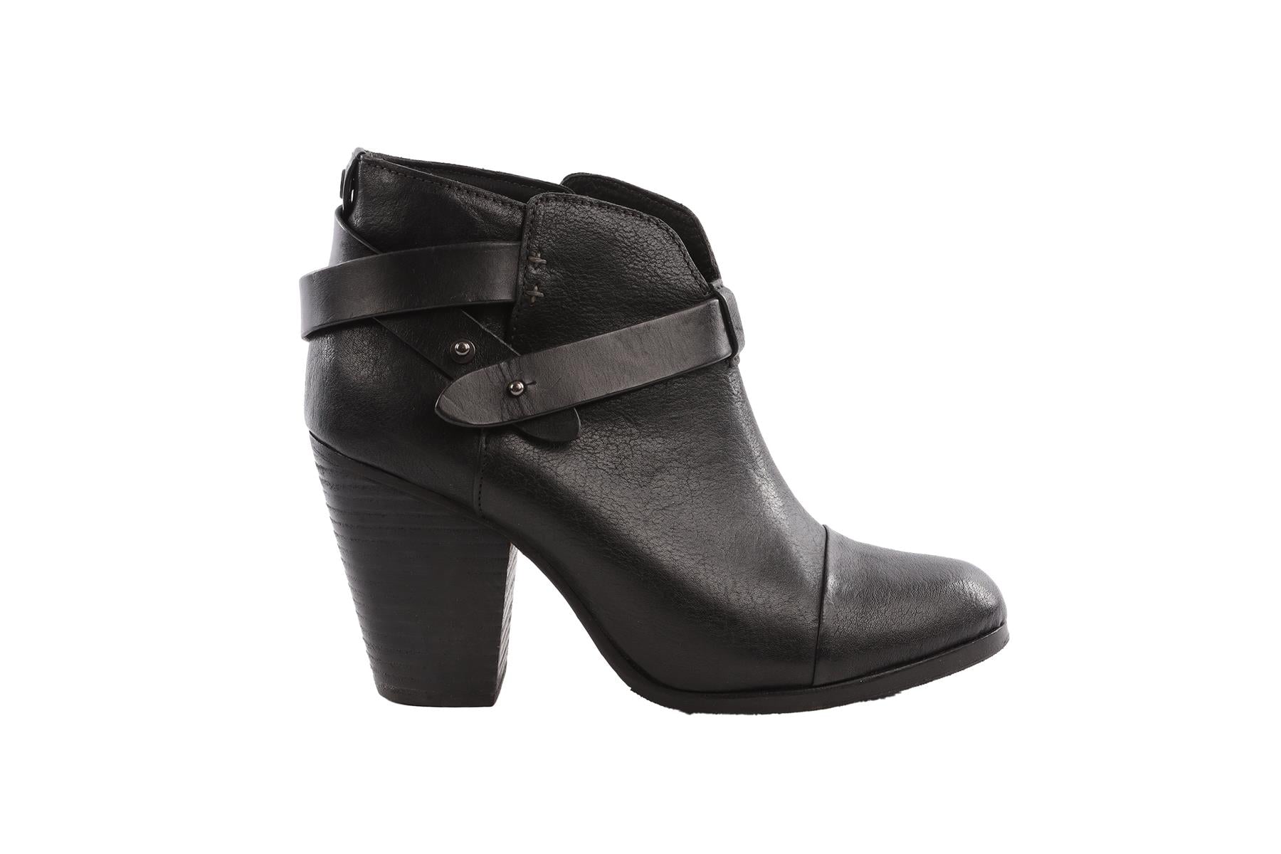 Rag & Bone Black Leather Ankle Boots. Black. Buckle fastening - Side. Does not come with - dustbag or box. EU 38 (UK 5, US 8). Insole: 9.5 in. Heel Height: 3.5 in.