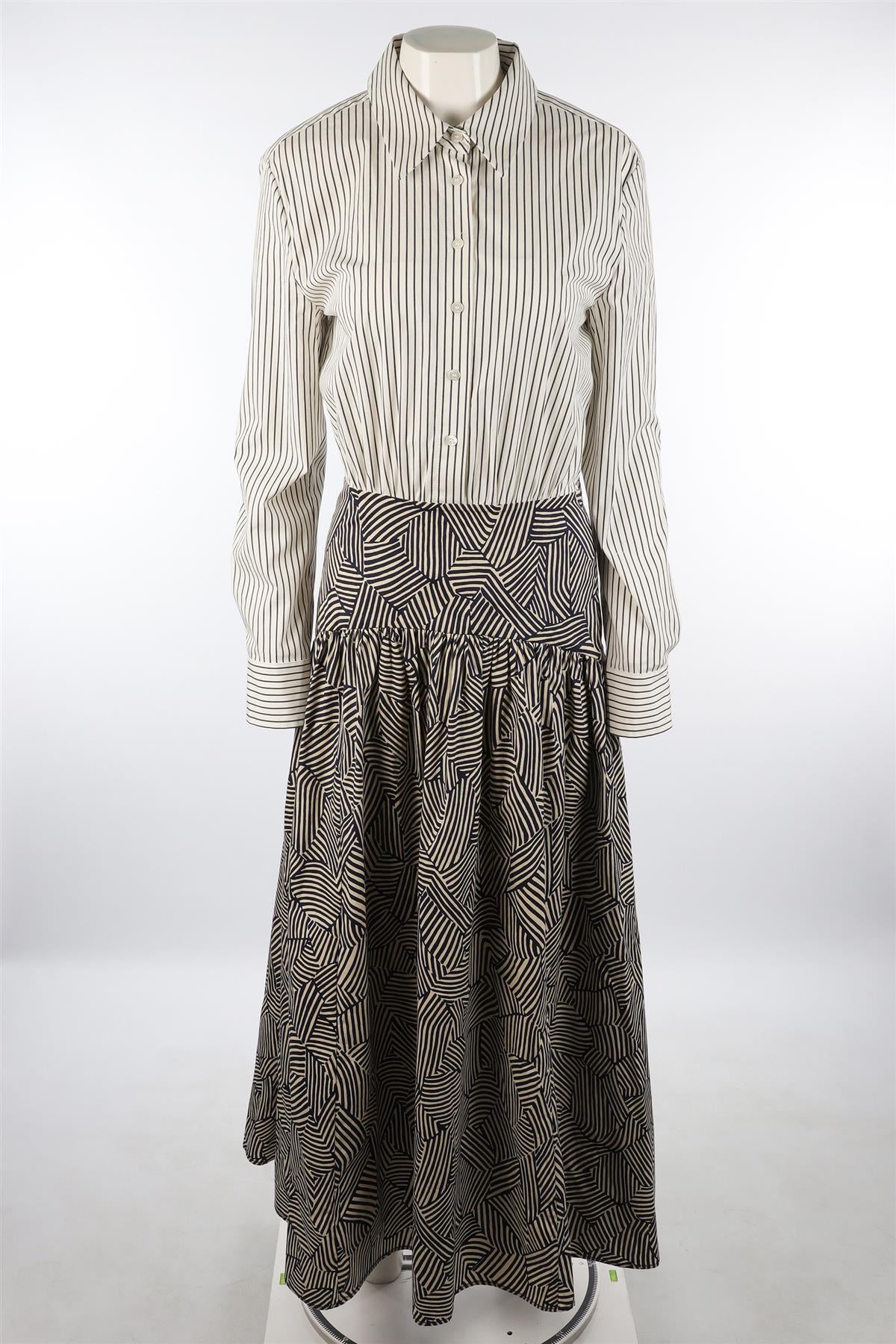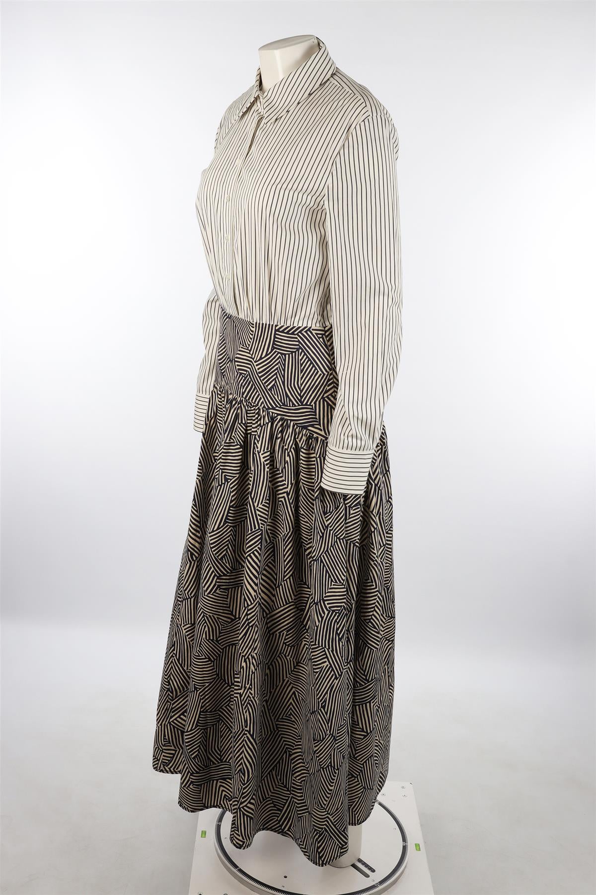 Staud Navy Cotton Maxi Dress. Navy and White. Long Sleeve. Crewneck. Button fastening - Front. 98% Cotton, 2% Elastane. US 2 (UK 6, FR 34, IT 38). Bust: 34 in. Waist: 27 in. Hips: 37 in. Length: 56 in.
