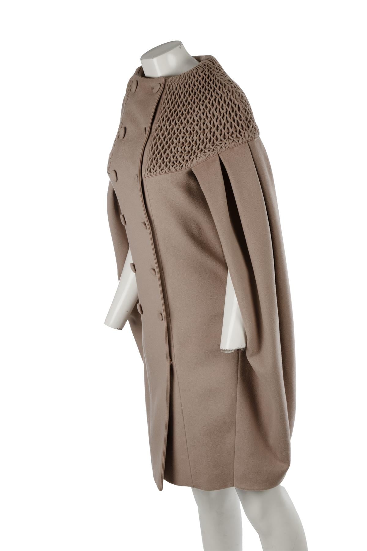 Valentino Taupe 2008 Wool Cape. Taupe. 3/4 Sleeve. Scoop Neck. Button fastening - Front. 85% Wool, 15% Cashmere. US 6 (UK 10, FR 38, IT 42). Shoulder to Shoulder: 18 in. Bust: 28 in. Waist: 34 in. Hips: 40 in. Length: 39 in.