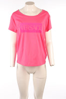 Versace Pink Cotton T-Shirt. Pink. Short Sleeve. Crewneck. Pull on. 100% Cotton. IT 42 (UK 10, US 6, FR 38). Bust: 37 in. Waist: 37 in. Hips: 40 in. Length: 21.25 in.
