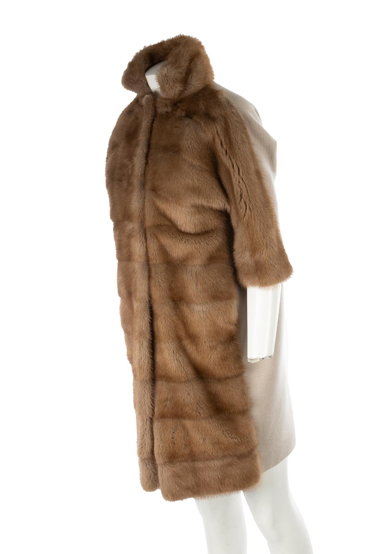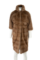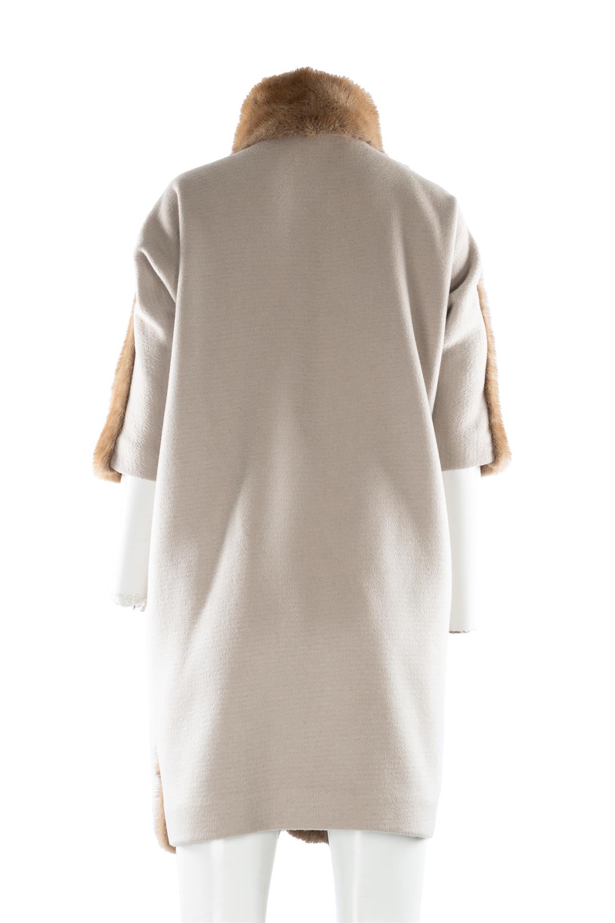 Vicedomini Brown Mink Fur Coat. Brown. Short Sleeve. Mock Neck. Hook and eye fastening - Side. 100% Cashmere, 100% Viscose. XSmall (UK 6, US 2, FR 34, IT 38). Shoulder to Shoulder: 19 in. Bust: 38 in. Waist: 42 in. Hips: 44 in. Length: 35 in.